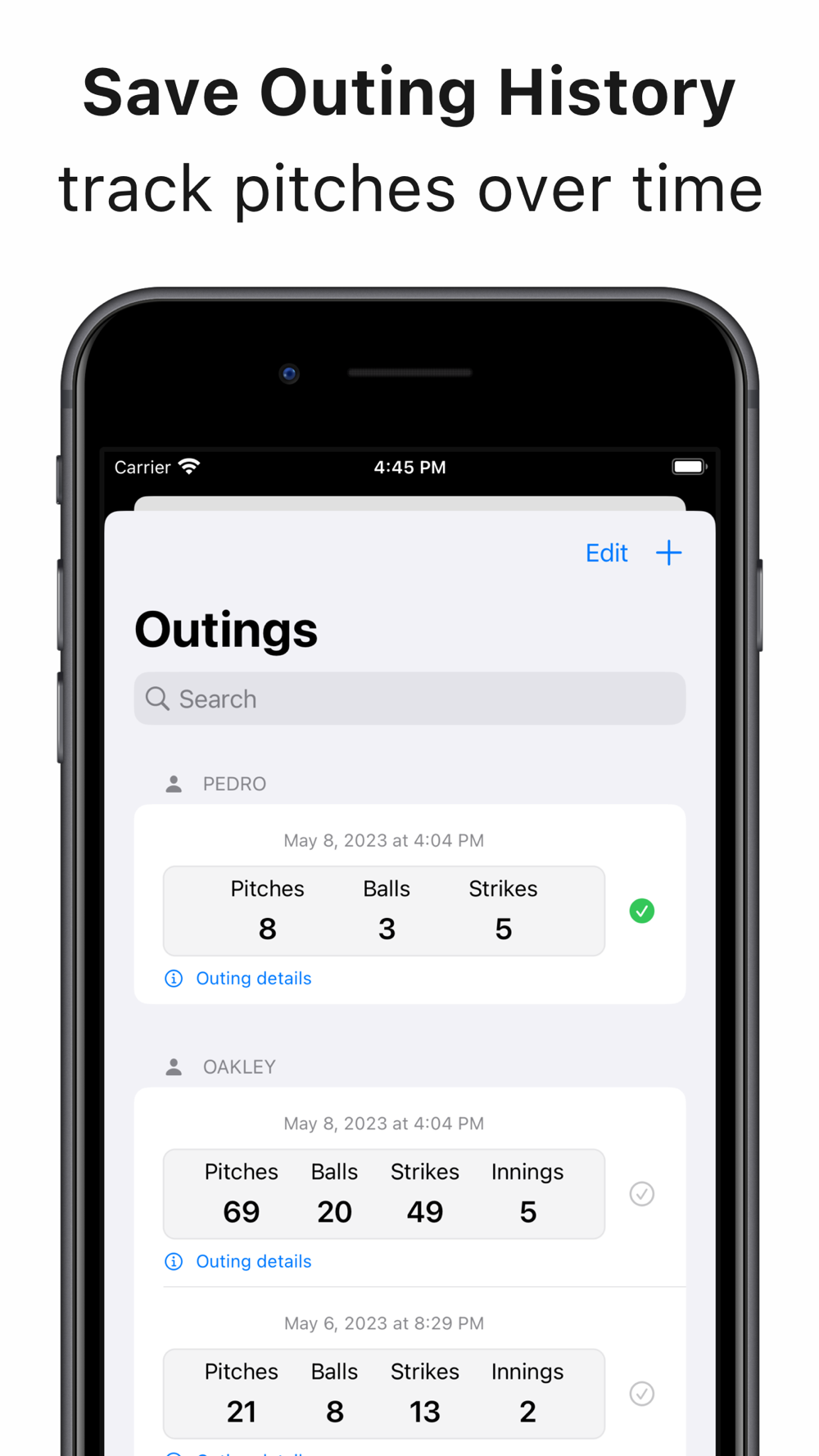 • Radar Gun (speed calculator) with the ability to customize pitching distances