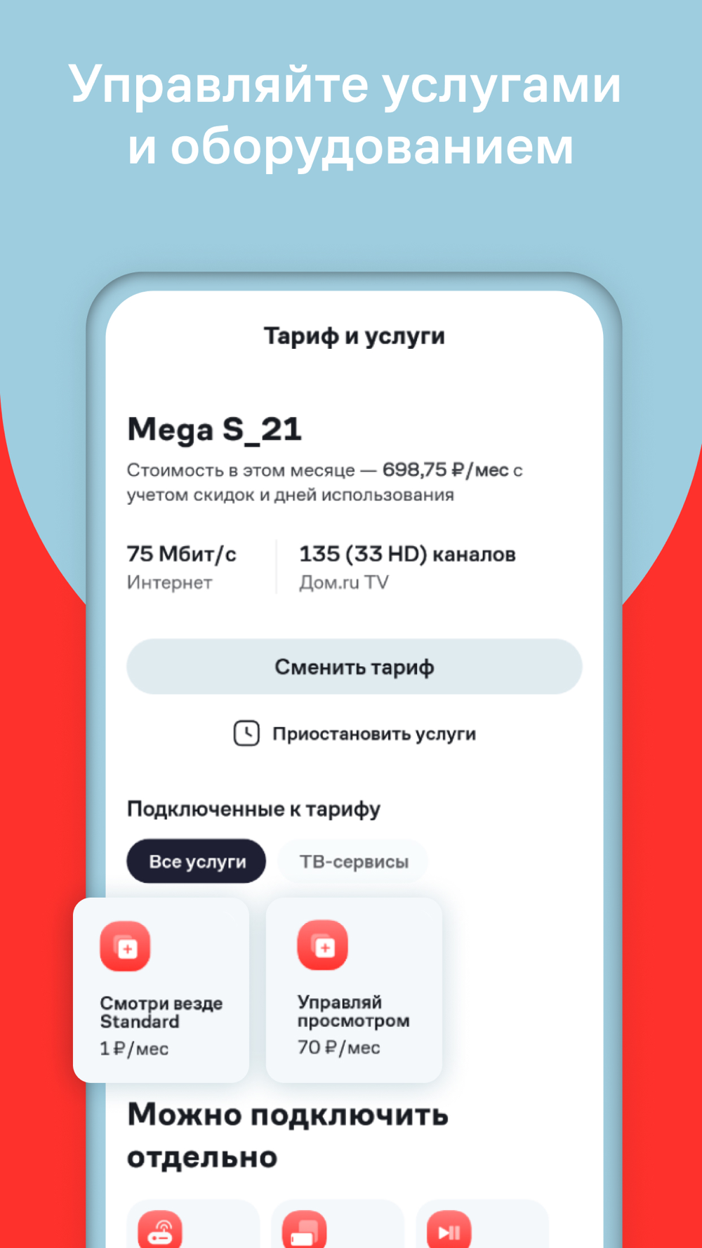 • Уезжаете в отпуск или на дачу? Вы можете приостановить услуги на определенный период времени и платить за услуги меньше. Просто выберите услуги, которые хотите приостановить и даты, в которые вы не планируете ими пользоваться. А если ваши планы изменились, возобновить услуги можно прямо в приложении.