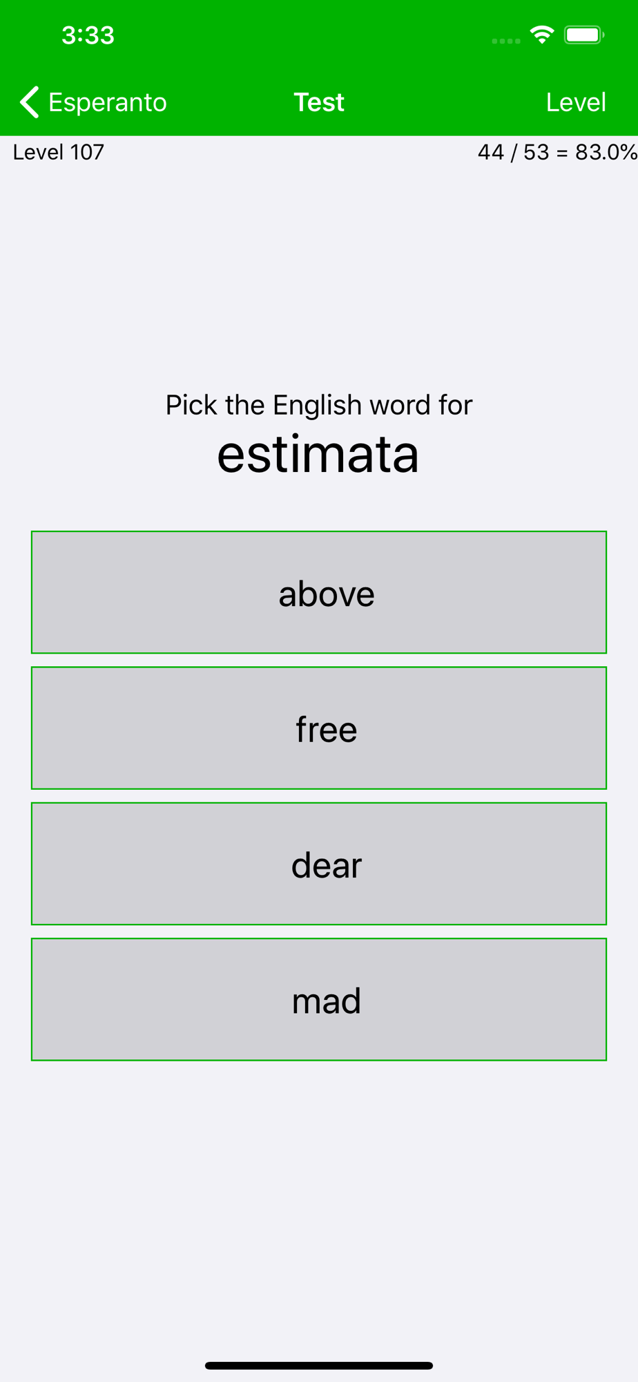 Liberation Philology Esperanto helps you build your Esperanto vocabulary in a convenient format available wherever you take your phone. It presents 1157 levels of vocabulary, each of which tests your ability to match a group of ten Esperanto words with their English equivalents. Your answers are immediately confirmed or corrected, and whenever you feel you've mastered a level, you can move on to the next.