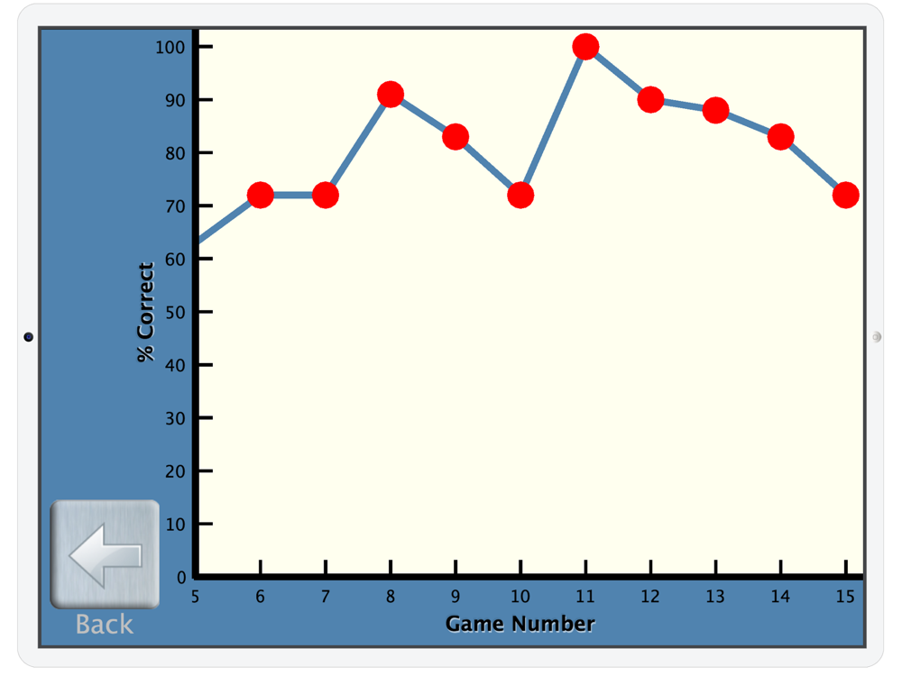 * Track data and statistics - At the end of the game, a graph of the child's data will be presented. Touch the graph to enlarge it, and then touch each data point to gather information about the child's performance.