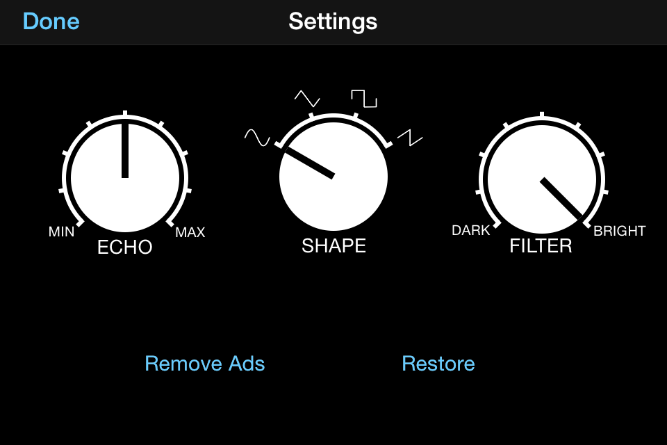 The Nebulous Theremin Synthesizer has been designed to re-create the classic sounds of a theremin, adapted for iOS devices. Touching the screen produces a tone. Moving to the right increases the pitch, and moving up increases the volume. Press the settings button to access additional settings such as echo, filter, and waveform types.