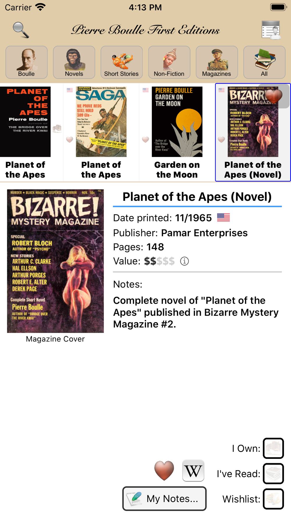 Boulle Editions is a Field Guide for aiding collectors to visually identify the First Edition novels and works of Pierre Boulle (famous for "Planet of the Apes", "Bridge over the River Kwai" and other World War II and fiction stories).