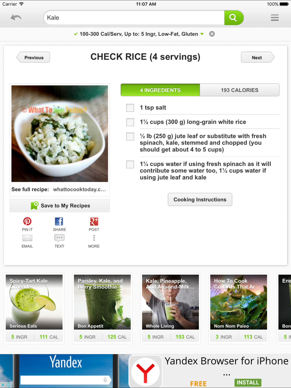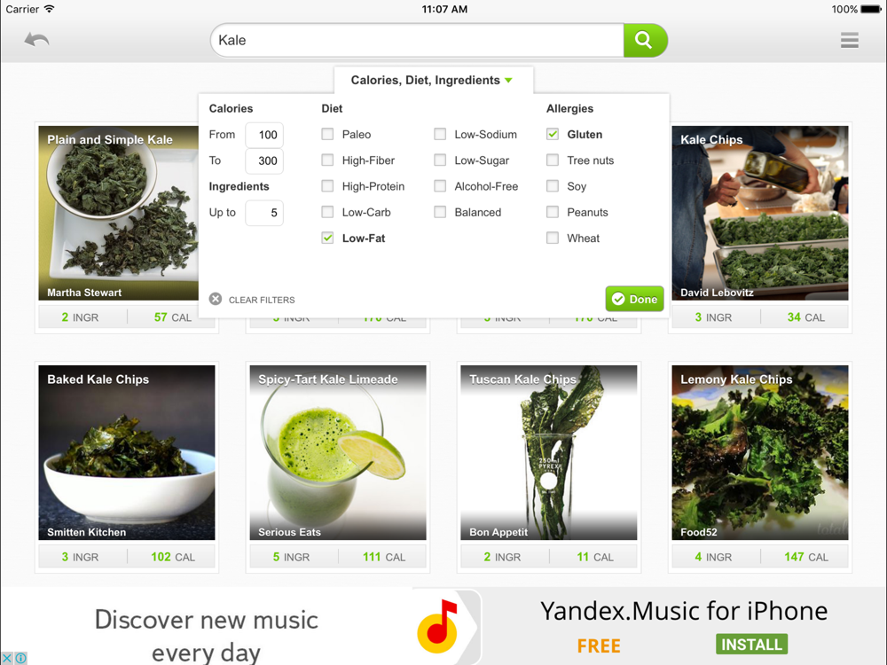 You can further limit your choice to fit your diet, be it gluten-free or under 400 calories per serving. And, for each recipe, we have provided full nutritional analysis. In fact, our app is the only one with consistent nutritional information for every recipe, no matter where it comes from.