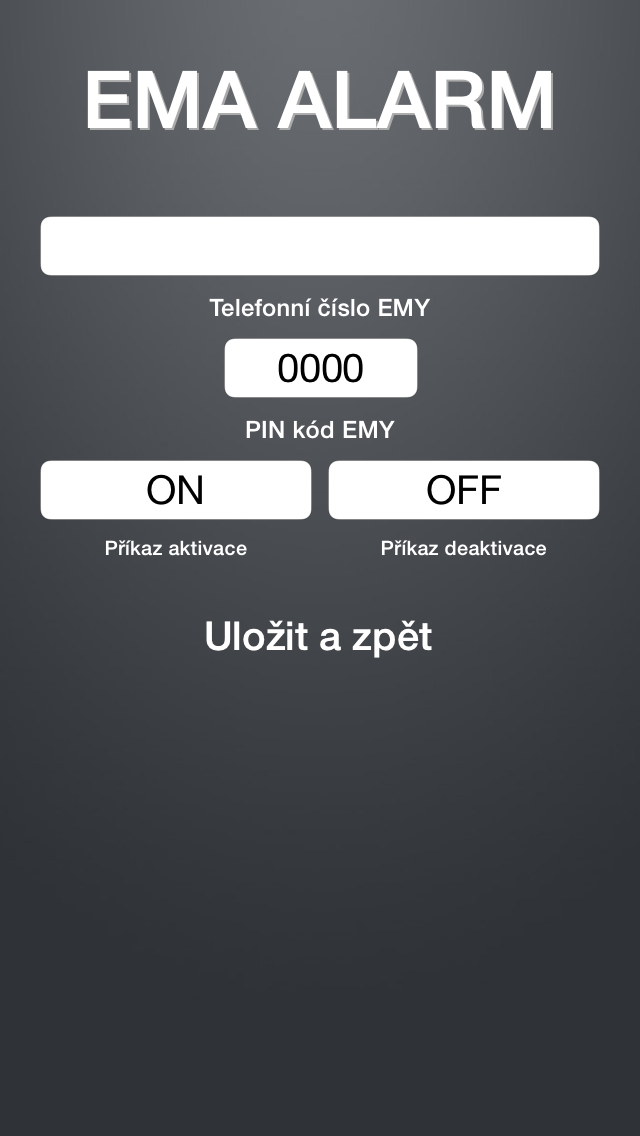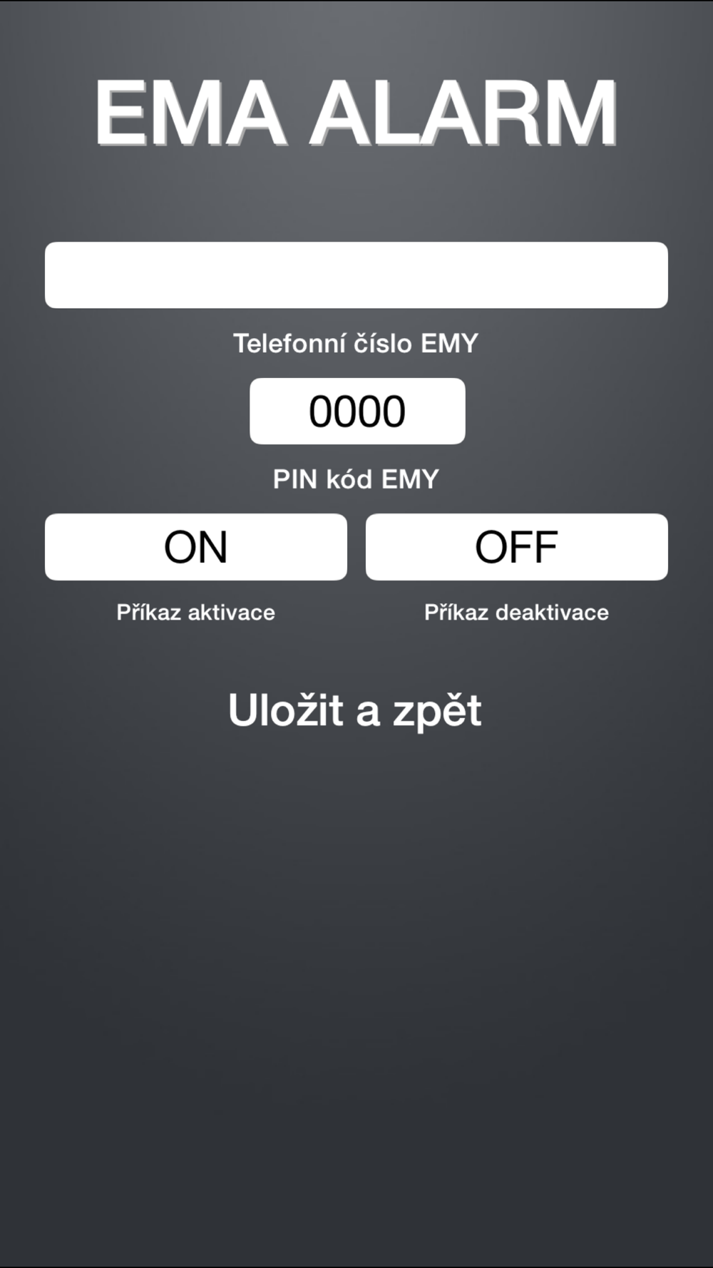 Při prvním spuštění nastavte Telefonní číslo EMY, PIN kód, případně vlastní příkaz pro aktivaci / deaktivaci.