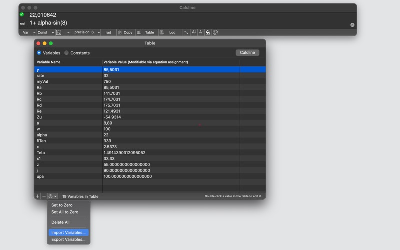 • Can work with all the variables and constants in a separate window, creating, deleting assigning them with click and edit