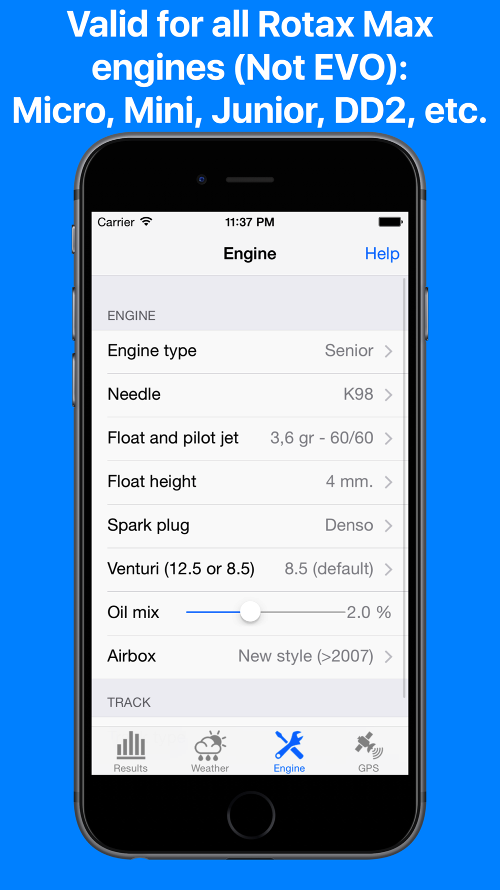 - Engine: you can set in this screen the information about the engine and the track, that is, the engine type (Senior, Junior, Minimax, Micromax, Supermax or DD2), the spark plug brand used, the needle type, the float/pilot jet combo, the float height, airbox type (new model or the old square model), track type (with long, short or medium straights), oil mix ratio and venturi type (12.5 or 8.5).
