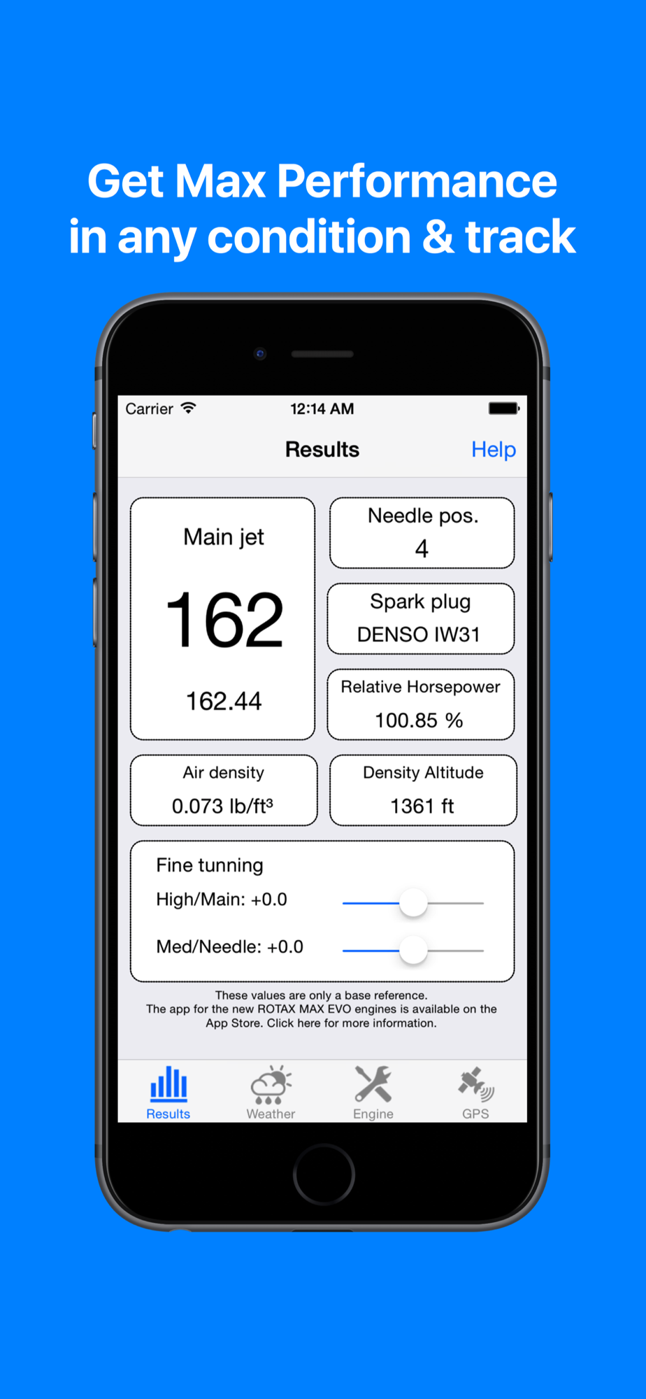 This app provides, using temperature, altitude, humidity and atmospheric pressure values, a recommendation about the jetting configuration and spark plug to use for Rotax Max Senior, Supermax, DD2, Junior, Minimax or Micromax.