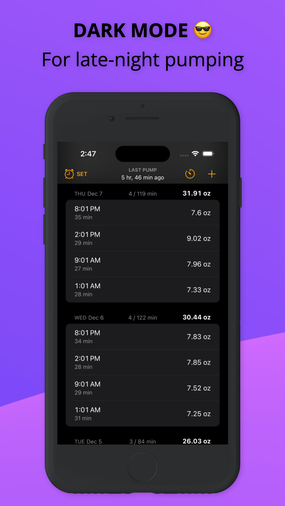 - Stats: PUMP LOG's detailed stats give you a clear picture of your pumping history and trends. This information can help you identify what's working and what's not, so you can make adjustments to your pumping routine to boost your milk production.