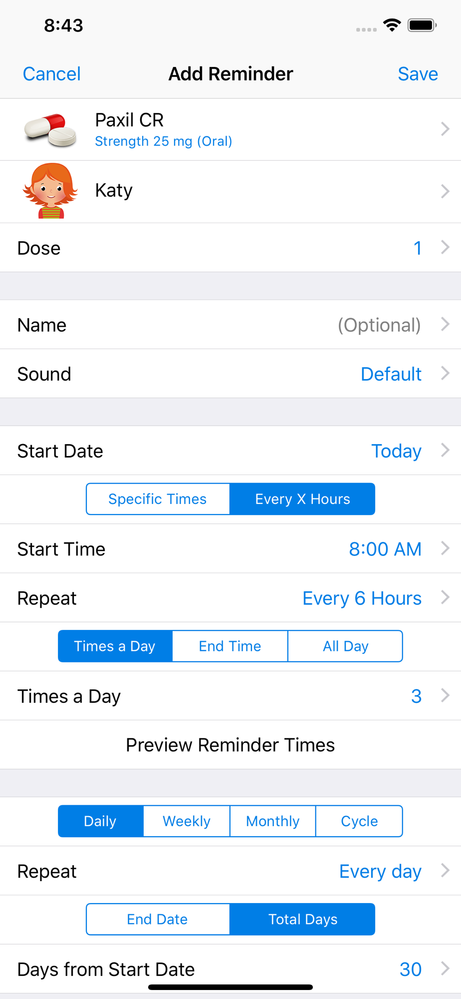 Pill Reminder is an easy-to-use and reliable app that helps you remember to take your medications at the right time. It allows you to create any type of recurring reminders (every X hours, specific times, daily, weekly, monthly, every X days, etc). It tracks the remaining quantity of each medication and shows a refill alert when running low.