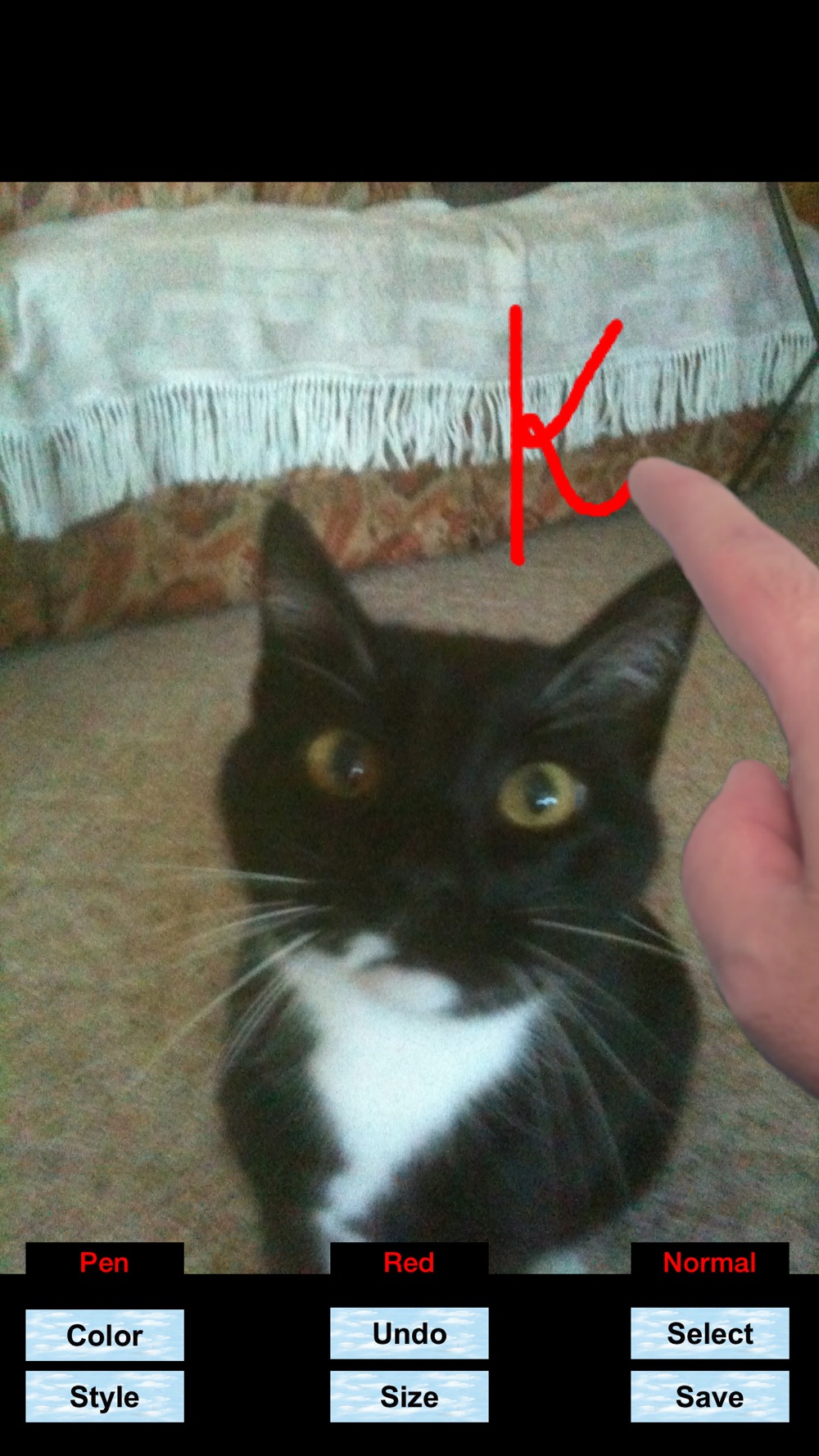 Simply select any photo and use your finger to write or draw on the photo. You can adjust colors and thickness of your handwriting, and can even write with various styles like barbed writing, smear, or even low ink style. Save your new image by simply tapping the save button. See screenshots.