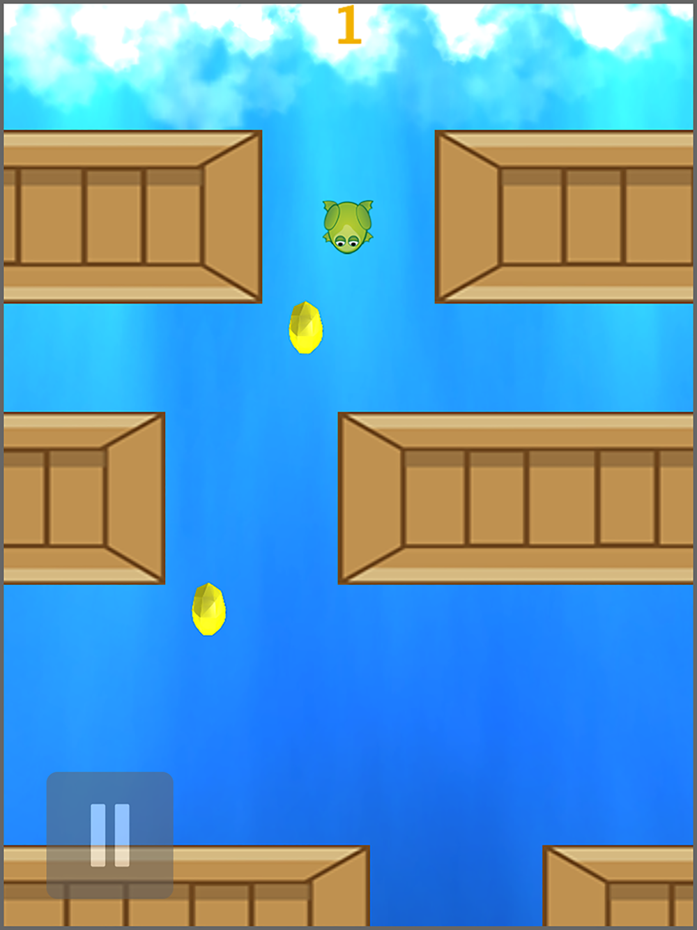 This hard game has a side-scrolling vertical format and the player controls a frog, attempting to swim between obstacles without coming into contact with them, taking diamonds to increase his score.