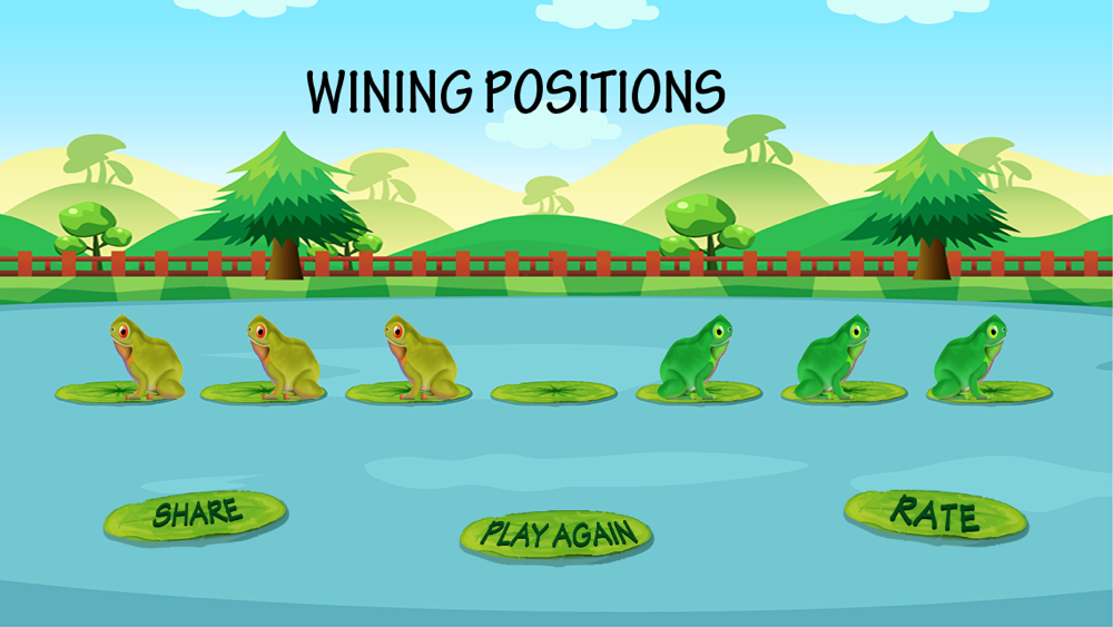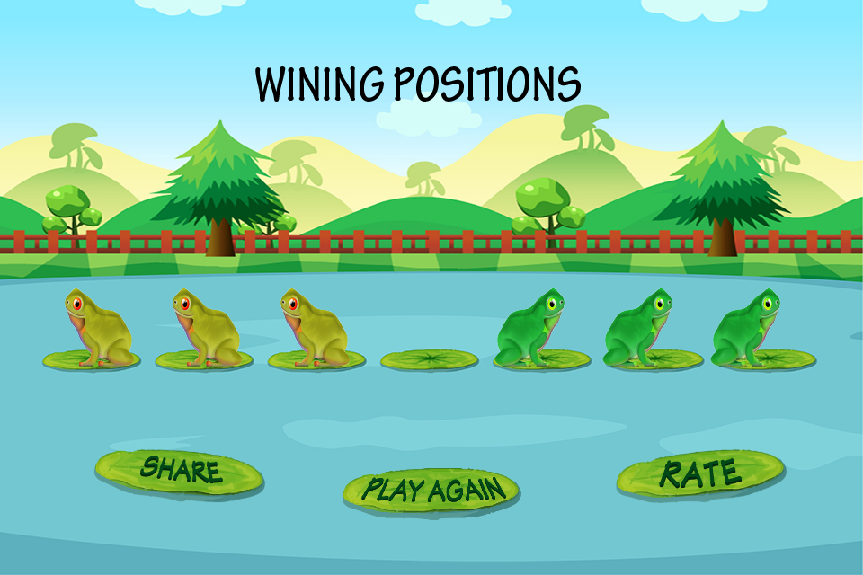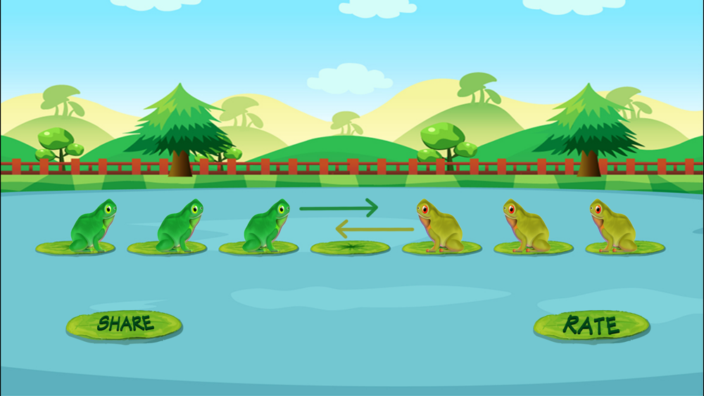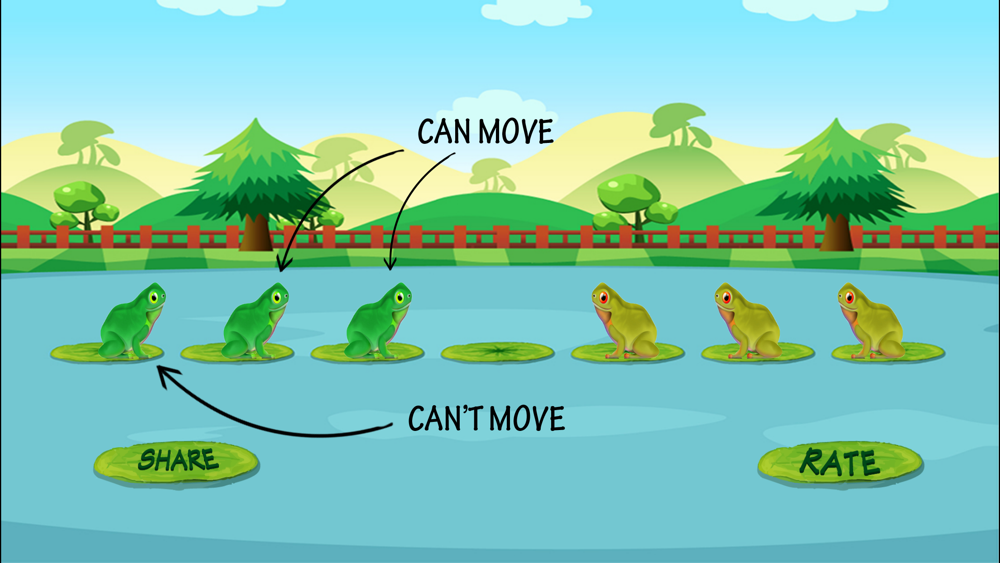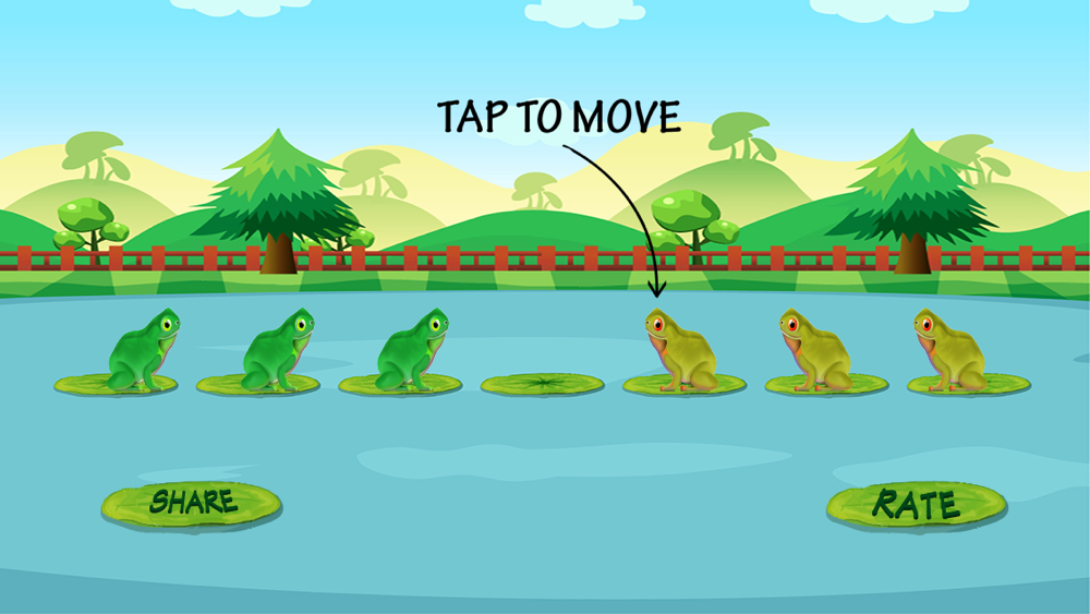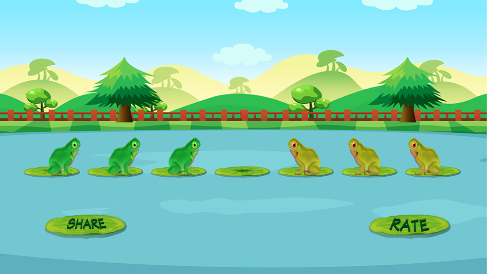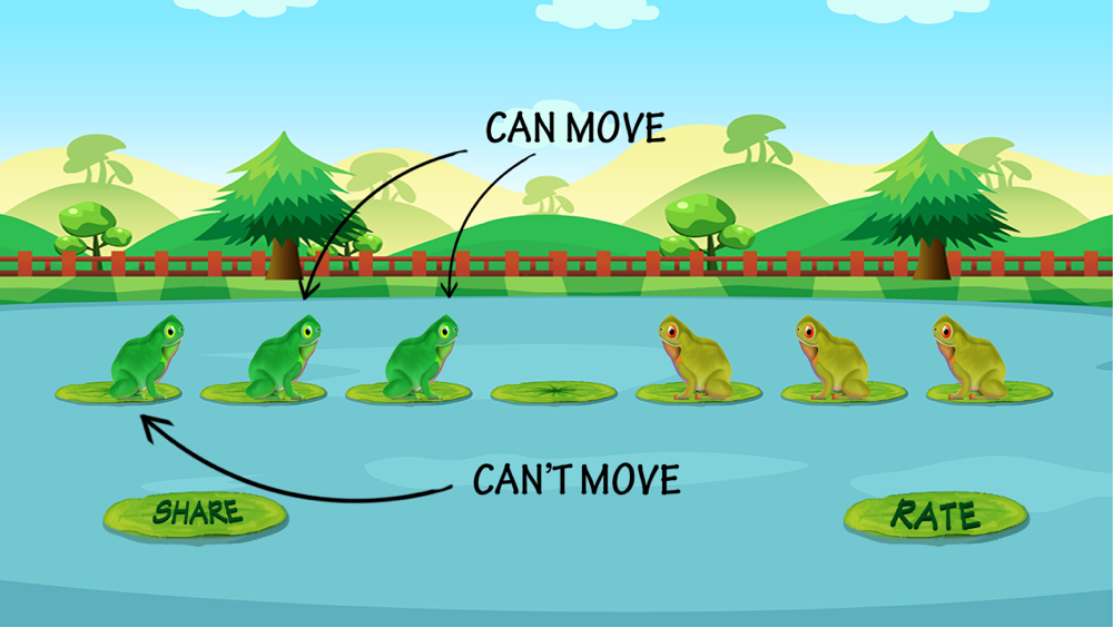 Move all the green and yellow frogs to the opposite sides. Click the frogs to move to a vacant leaf. A frog can jump over only one other frog to land onto a vacant leaf. Frogs cannot jump backwards. If you find you have blocked your frogs into an impossible position, you can play again.