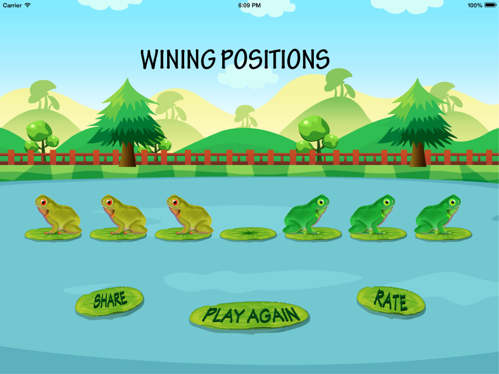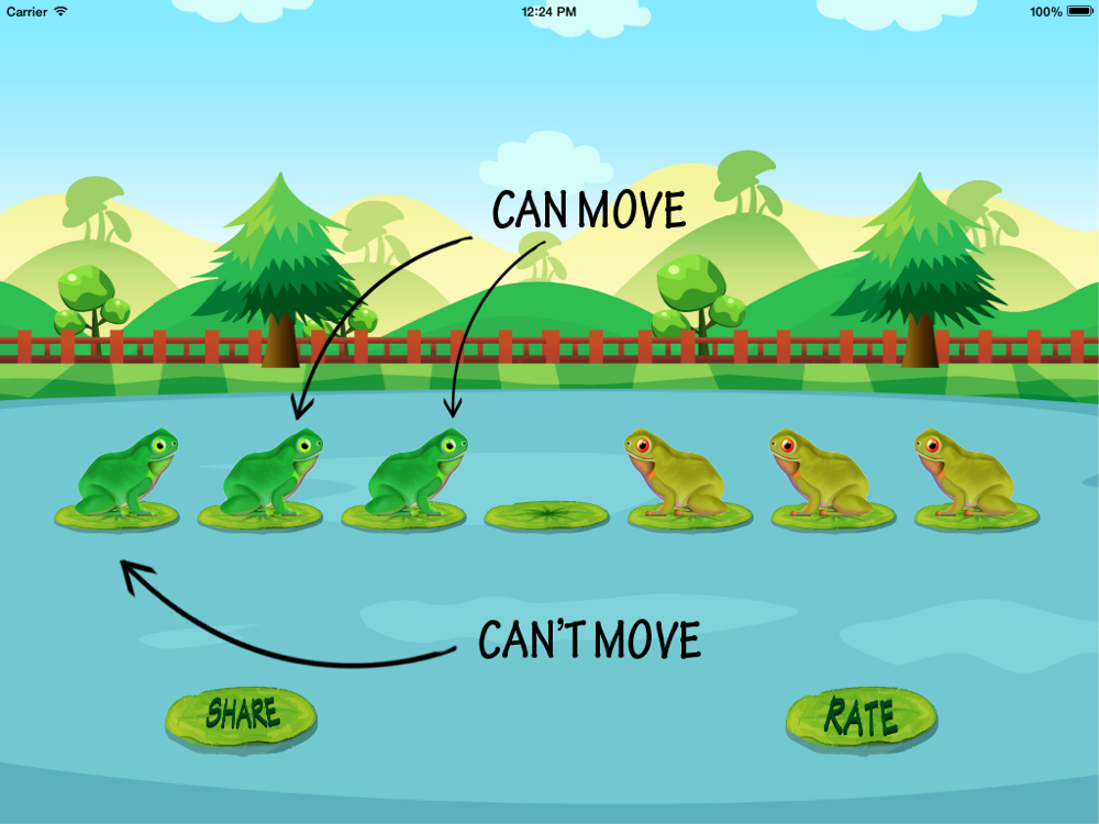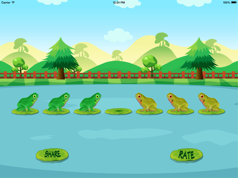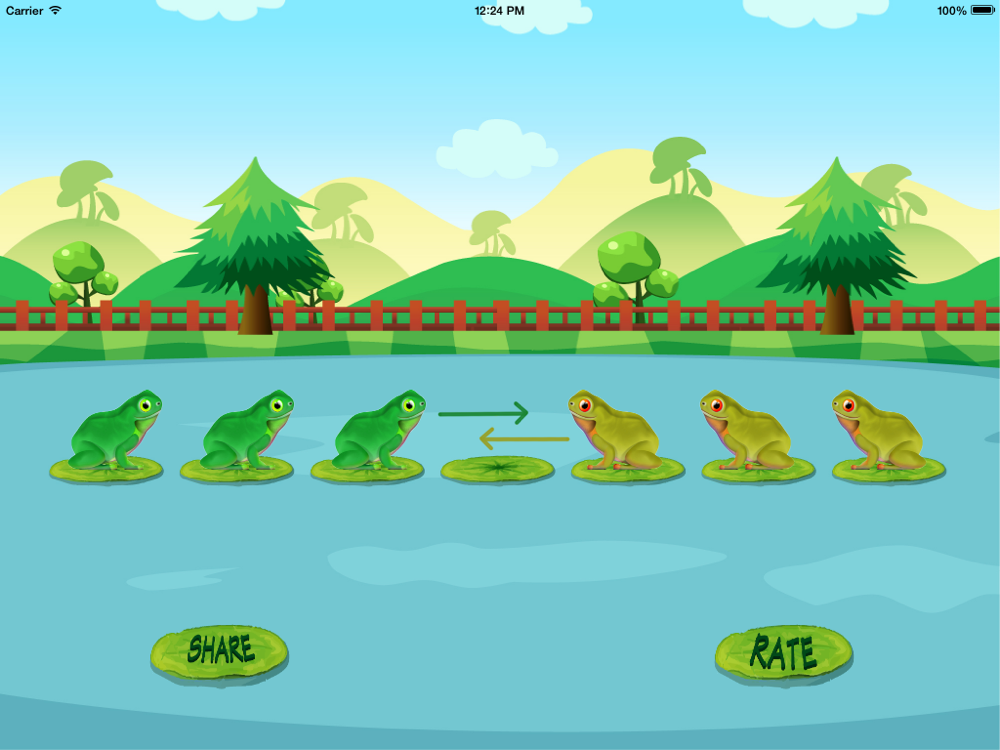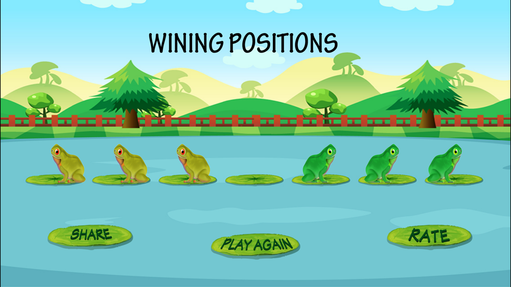 Move all the green and yellow frogs to the opposite sides. Click the frogs to move to a vacant leaf. A frog can jump over only one other frog to land onto a vacant leaf. Frogs cannot jump backwards. If you find you have blocked your frogs into an impossible position, you can play again.