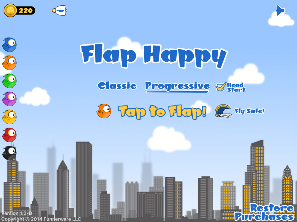The smash hit reimagined! • Progressive or Classic difficulty! • Crash Helmets! • Jet Boosts! • Head starts! • Unique hazards! • Special death effects! • 6 birds to choose from! • See why Flap Happy is best in its class!