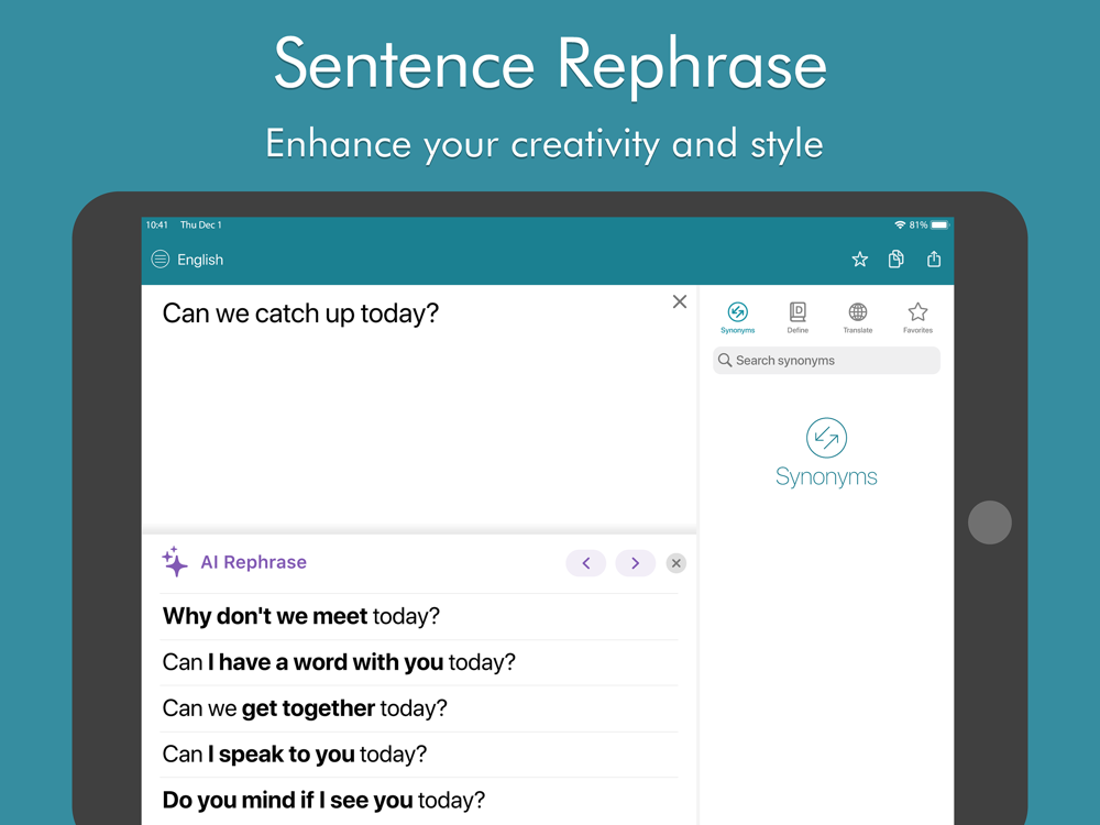 Elevate your writing with our magical Rephraser and boost your vocabulary with integrated synonyms.