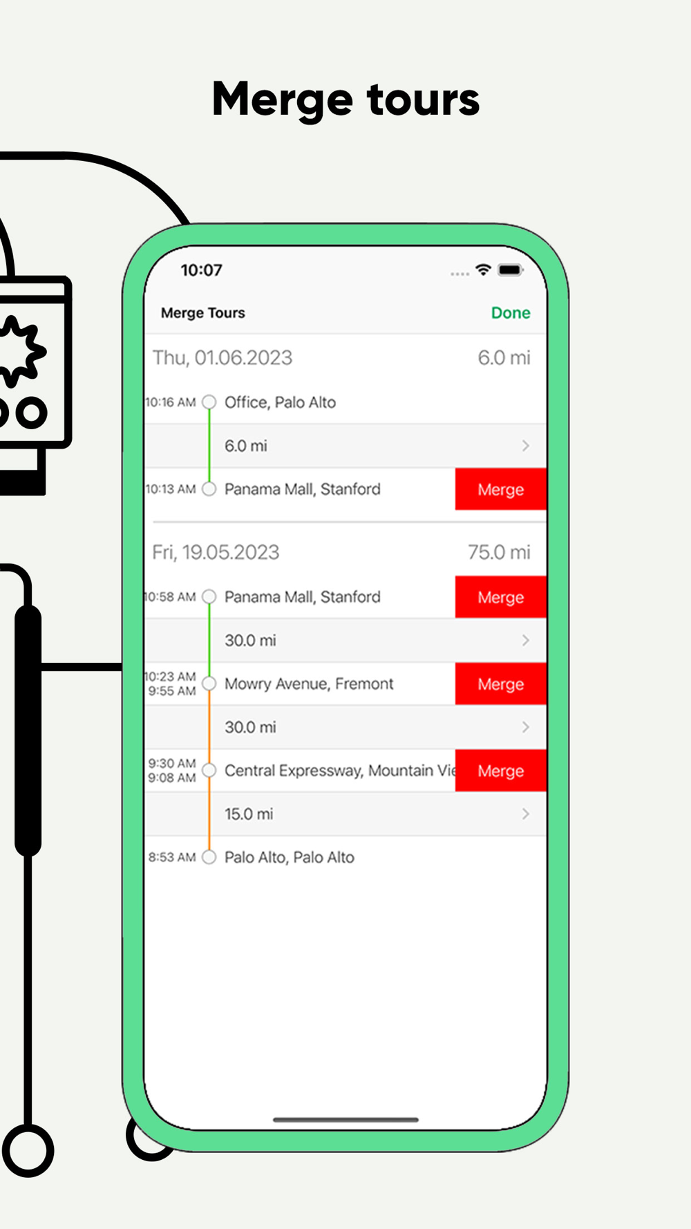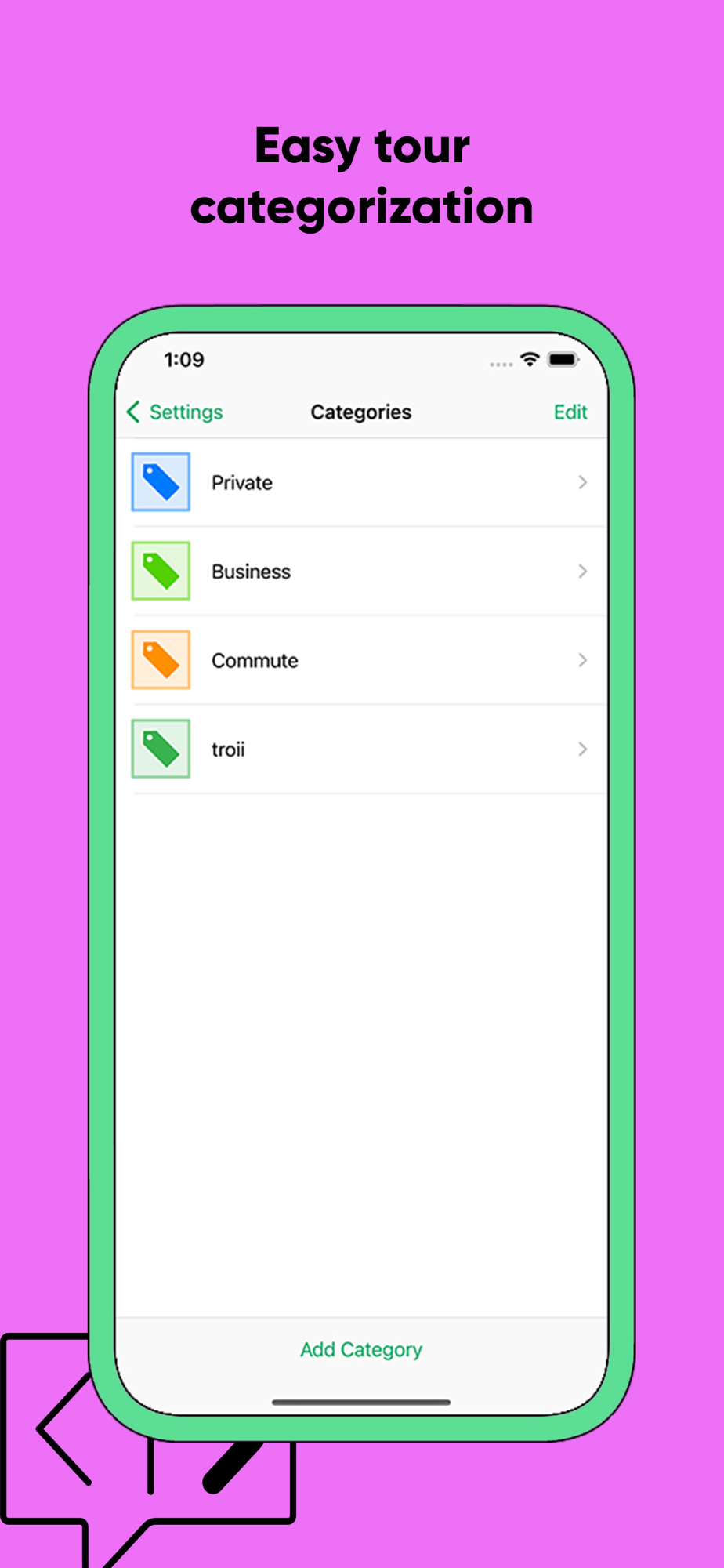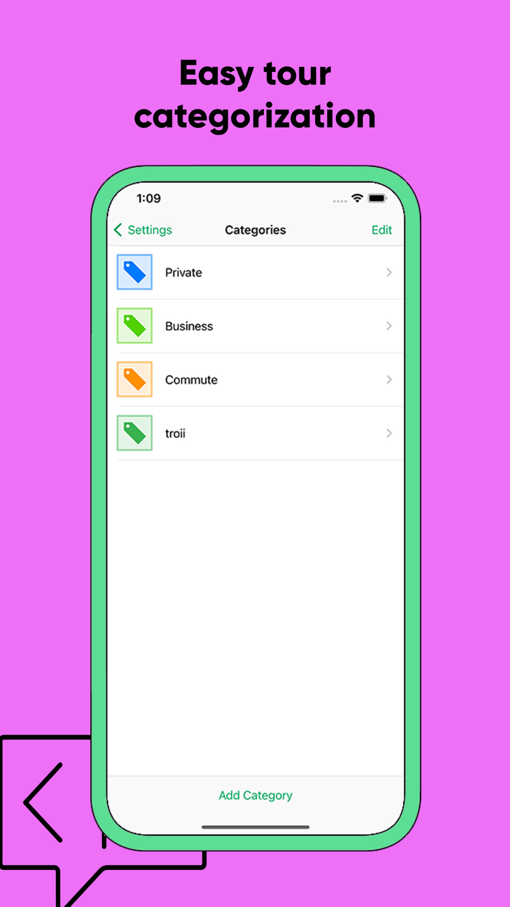 - Create your own categories and classify your trips as work-related, personal, drives home and so on.