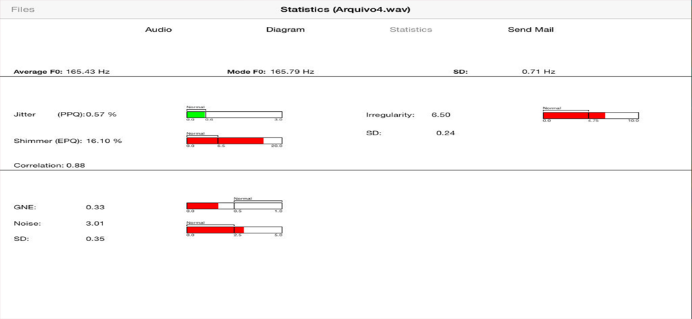 The statistics screen displays the acoustic analysis values of fundamental frequency, jitter, shimmer, irregularity, noise rate and GNE (Glottal to Noise Excitation).