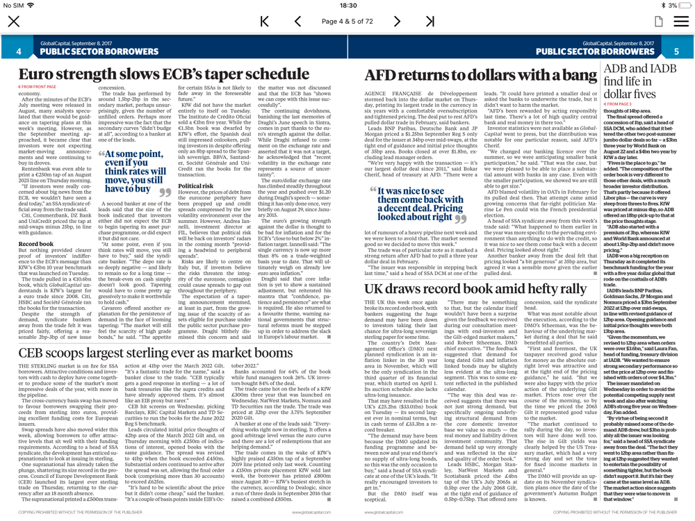 Global Capital descends directly from EuroWeek (“the voice of the markets”), which has been covering new issues in primary markets for 26 years. Joining the platform are also several key capital markets publications from the Euromoney Institutional Investor Group: Asiamoney, Total Securitization and Derivatives Week.