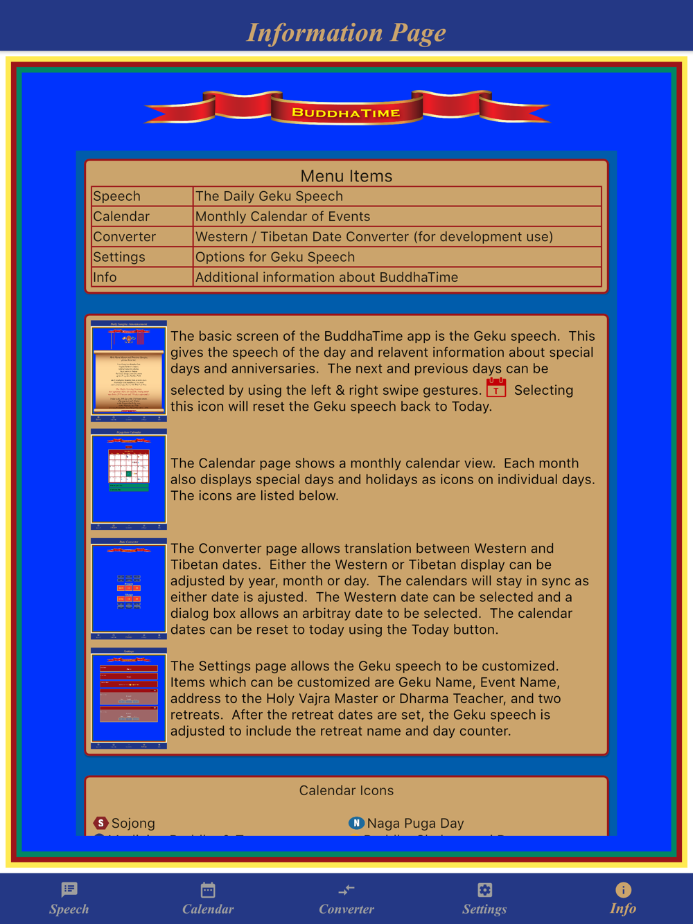 BuddhaTime provides up to date information for the Geku during Dzogchen practice of the Buddha Path. BuddhaTime incudes the Geku speech, conversion of the western calendar dates to the Tibetan calendar, and a listing of major Dzogchen/Tibetan holidays.