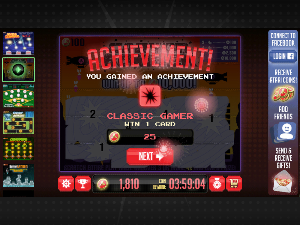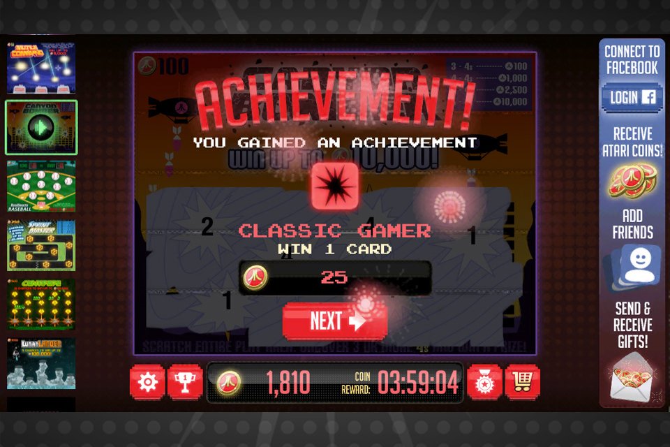 Collect coins often to buy more valuable Atari Scratcher tickets and uncover giant Atari Coin prizes! Collect all the Achievements, and send gifts to your Facebook friends to increase the scratching fun.
