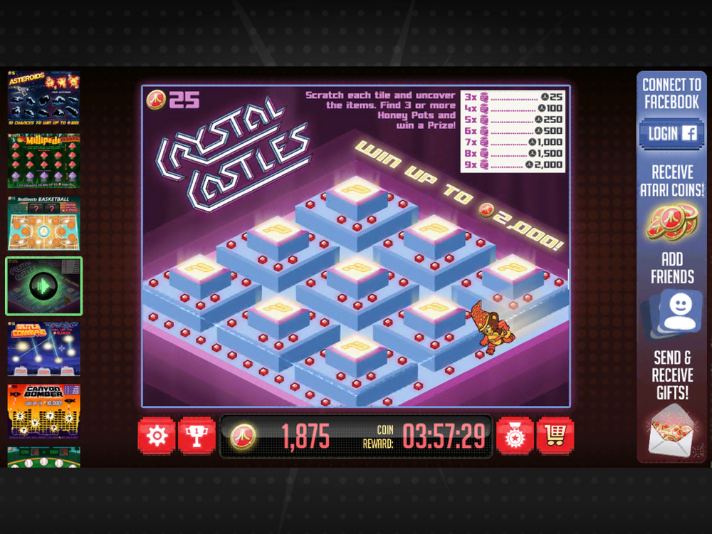 CRYSTAL CASTLES – Scratch the nine spaces on the board. Reveal three or more Honey Pots to win a prize! Win up to 2,000 Atari Coins.