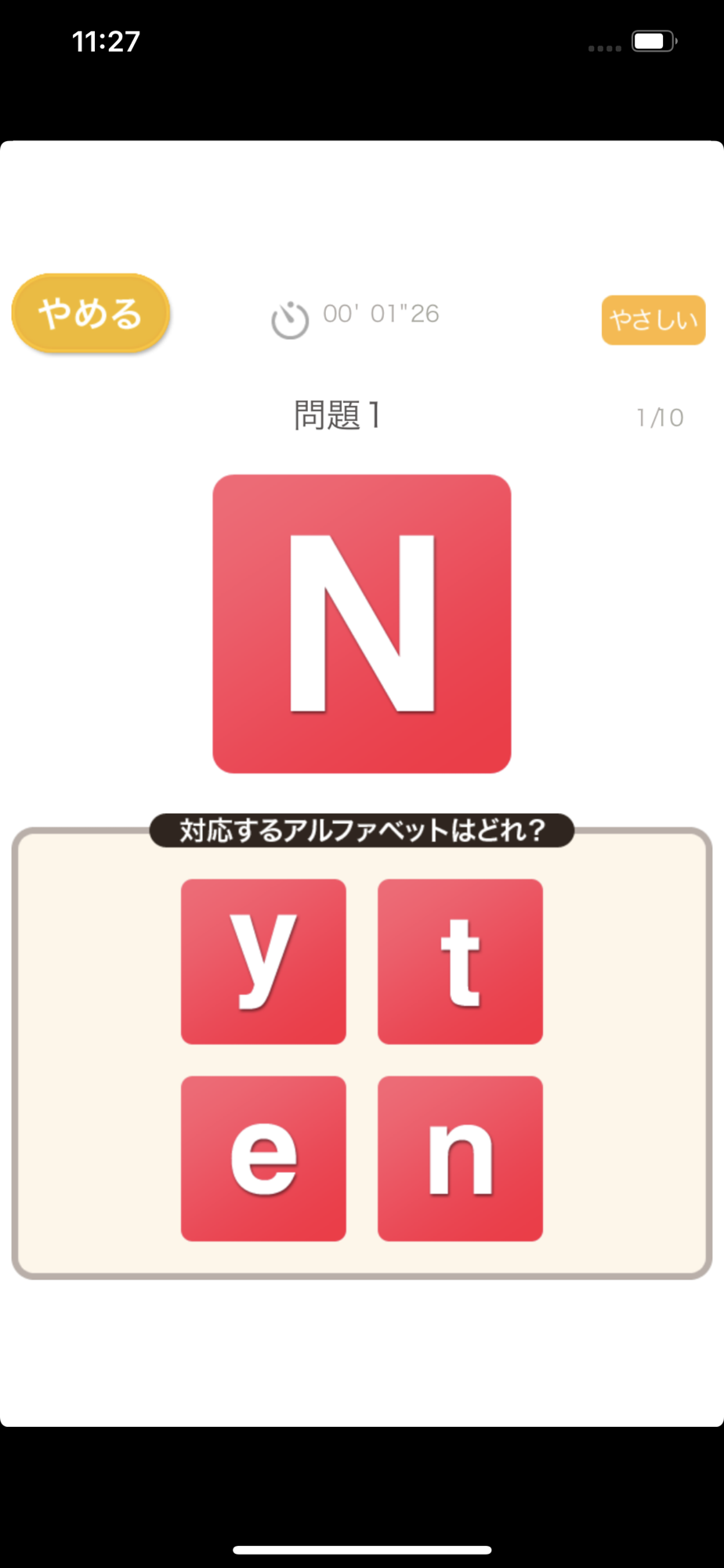 大文字・小文字それぞれに対応するアルファベットを表示されるパネルの中から当てるアプリです。
