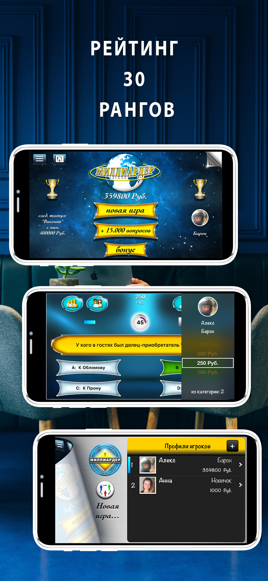 Викторина для iPhone & iPad. Для того, чтобы выиграть главный приз, т.е. миллионы игровых рублей, необходимо правильно ответить на 15 вопросов из различных областей знаний на сложном уровне игры.