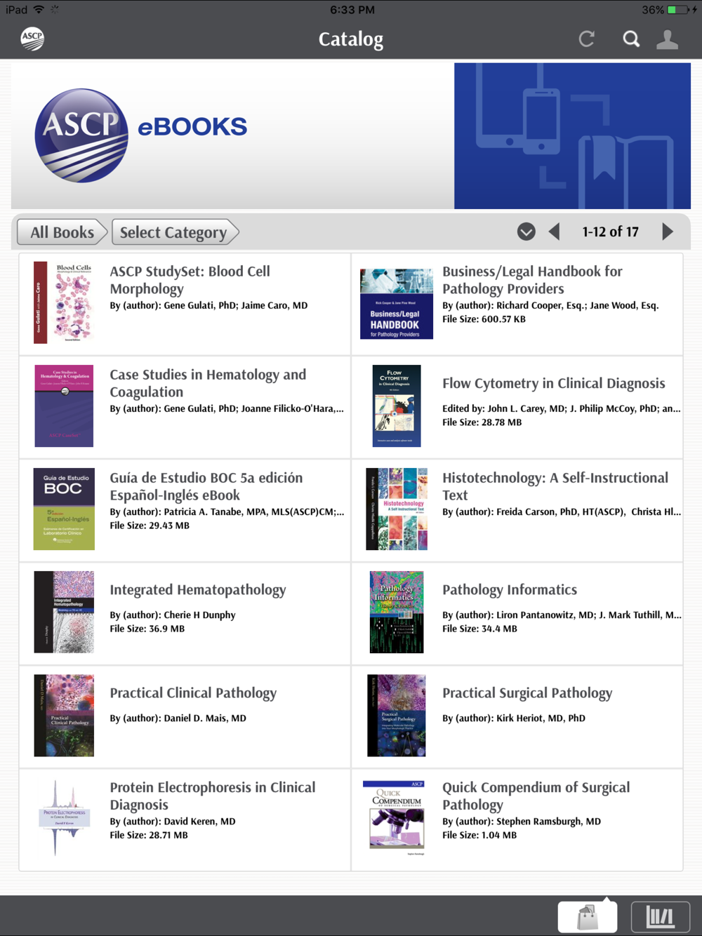 Visit the ASCP bookstore online to browse and purchase eBooks. Then log in to the ASCP eBooks app using the same user credentials used in the ASCP bookstore, and your purchases will be available for download. Be sure to hit the refresh button at the top of the app to see recent purchases.