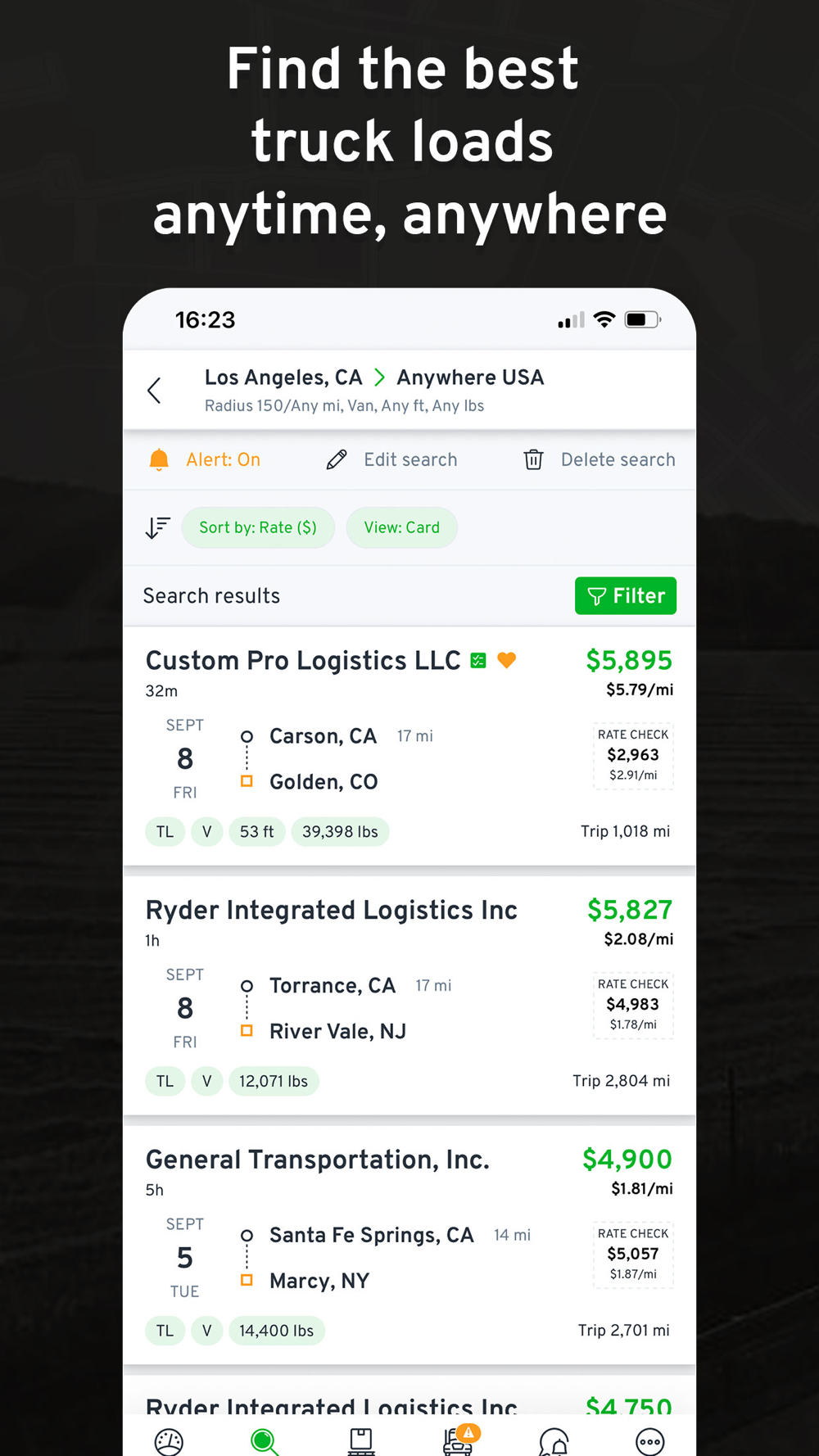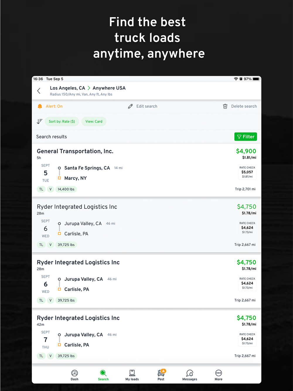 - Find loads by city, state, zip code or GPS based*