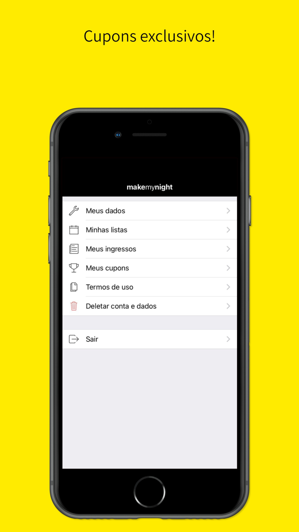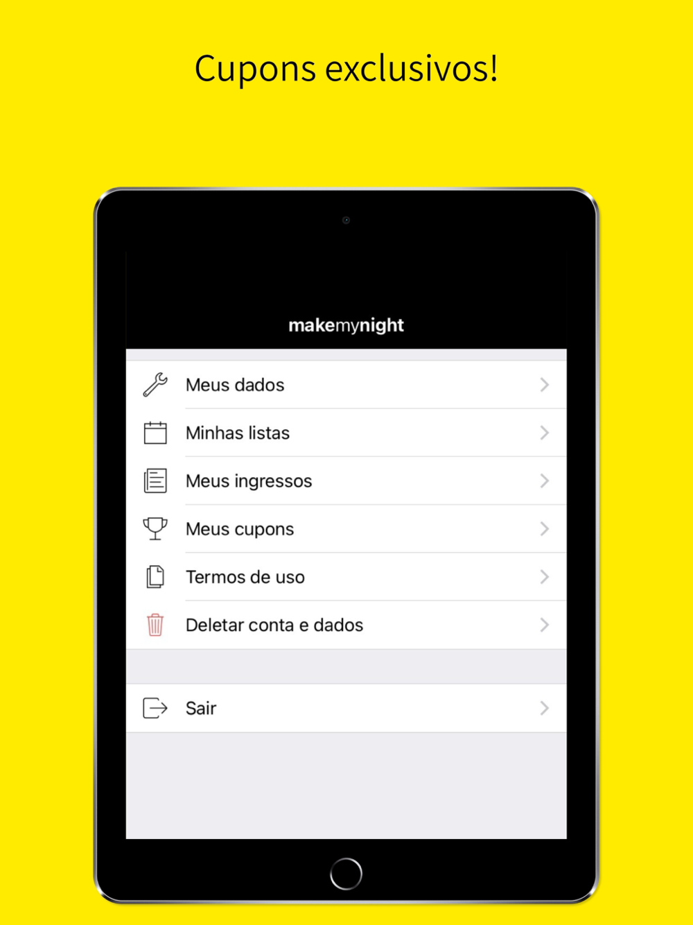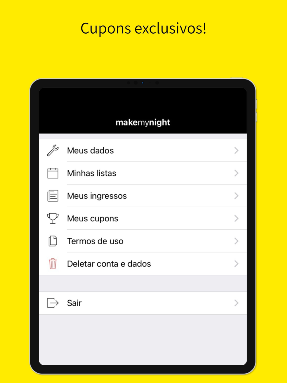 O MakeMyNight é um aplicativo de BENEFÍCIOS onde você pode acompanhar os melhores eventos, participar de listas VIP exclusivas e emitir PROMO todo dia através dos cupons liberados no app.