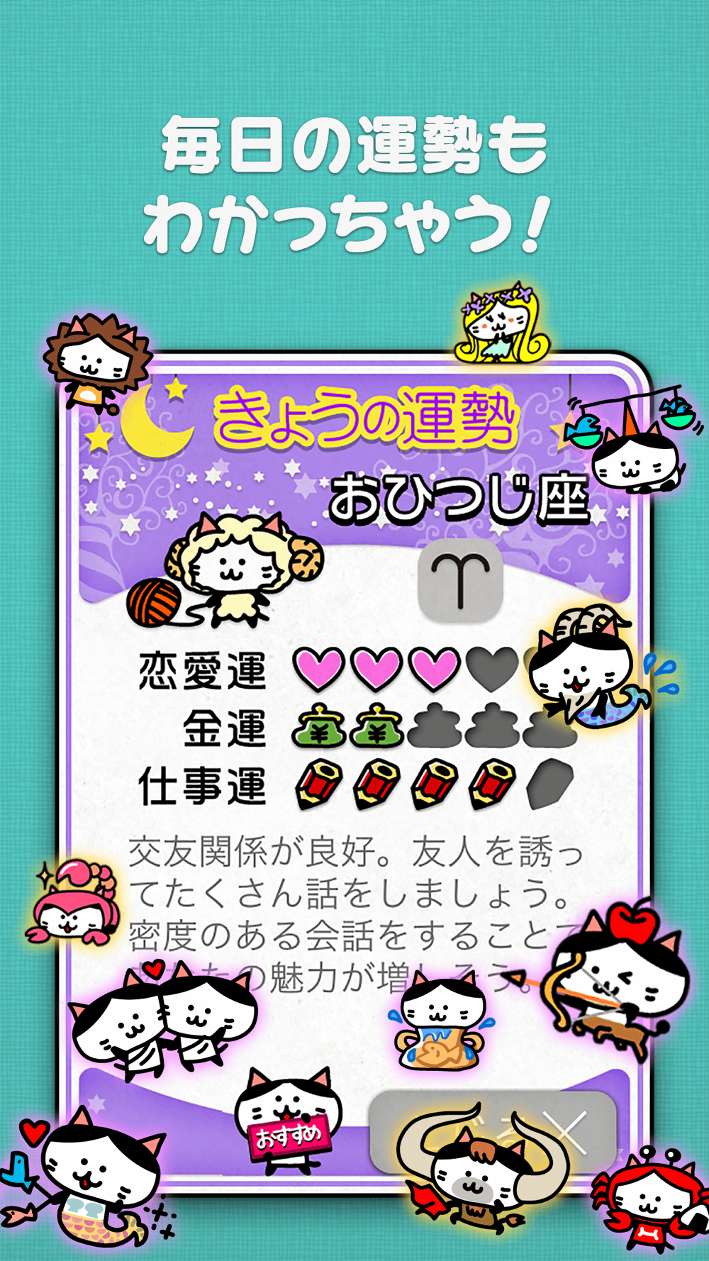 ねこのマロが占う毎日の「12星座占い」やふくろう博士が解説する「お天気解説」などの機能も充実!毎日使える要素がたくさん詰まってます!