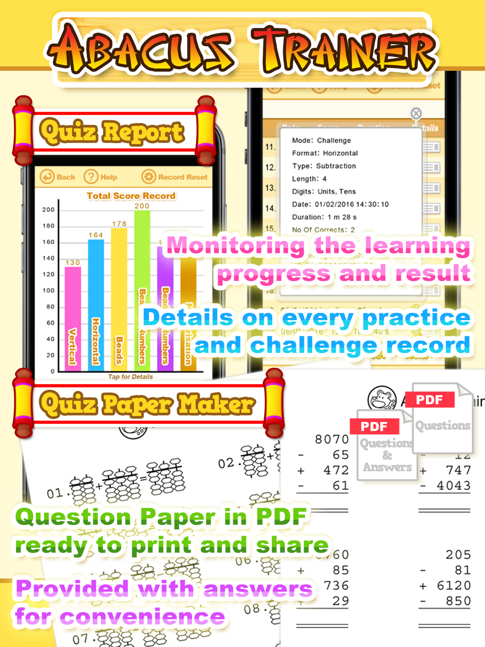 No matter practice or challenge modes, the performance, score and every detail will be recorded in report, which is useful for learning progress monitoring. The report records assist you to find out the strength and weakness, a customized approach in abacus training can be derived as a result.