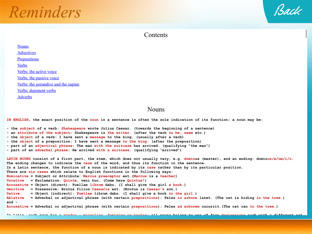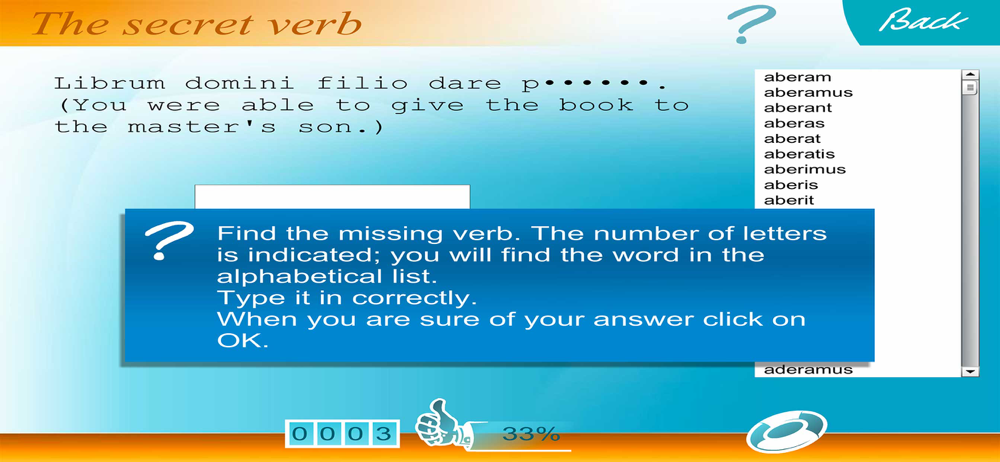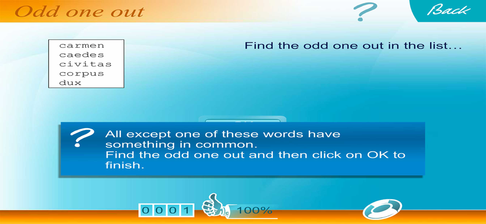The many different types of exercises offered (multiple-choice questions, puzzles, rearranging of letters and sentences, word-guessing games, etc.) enables learners to assimilate the essentials of vocabulary and structure, to consolidate their knowledge of basic grammar and syntax and to improve their translation skills between Latin and English.