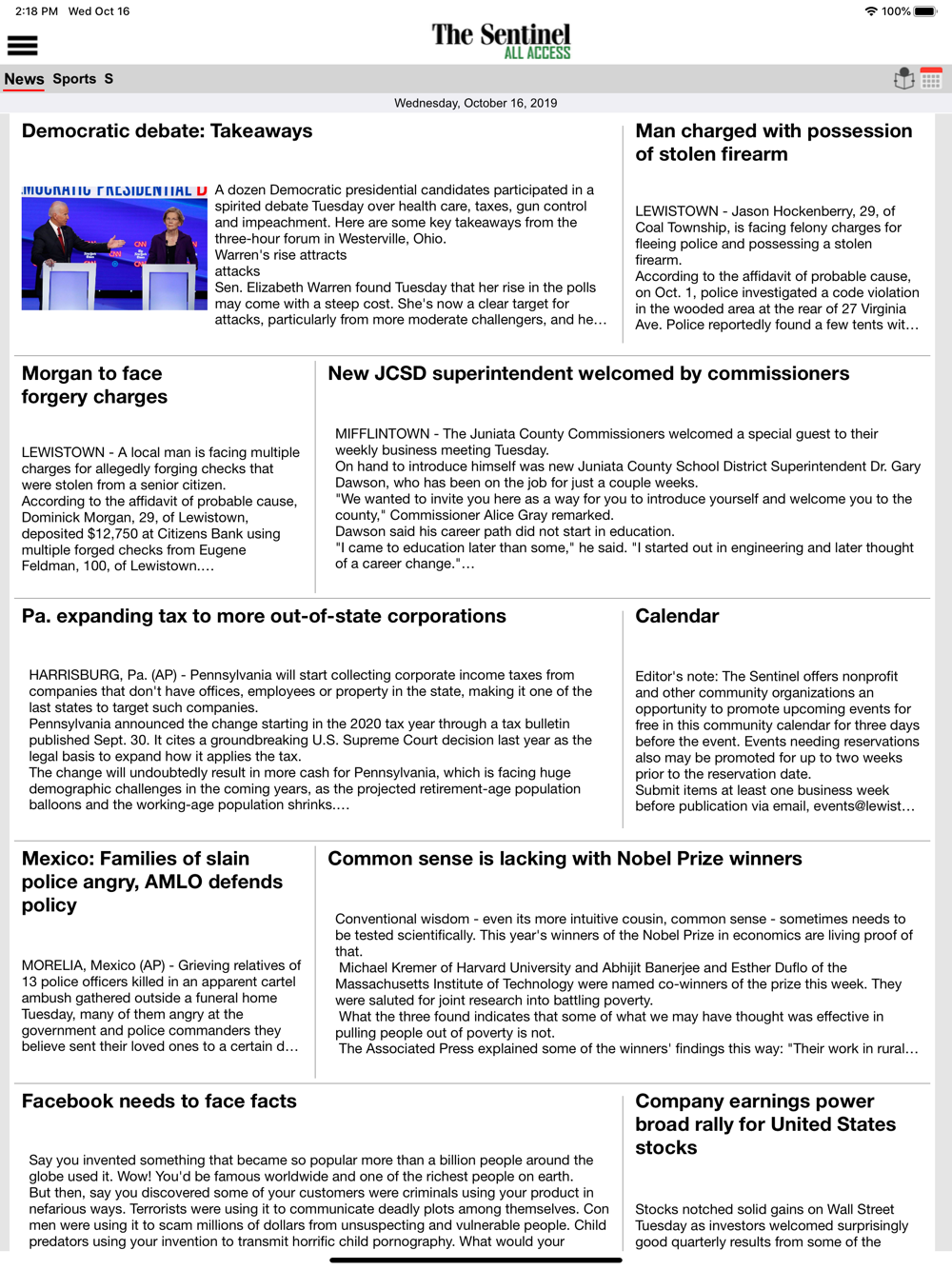 Stay on top of news from Lewistown and surrounding areas by receiving the full print version of the The Sentinel on your iPhone or iPad. Every page of every edition is delivered to your device. The Sentinel is the best source for local and national news, sports, weather and features in the Lewistown and Mifflin County area. Download the app to view the printed pages of the newspaper or read headlines and stories along with related photos in a built-in story viewer.