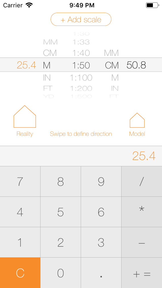 When the scale is set to 1:1 the app allows conversions between metric and imperial system.