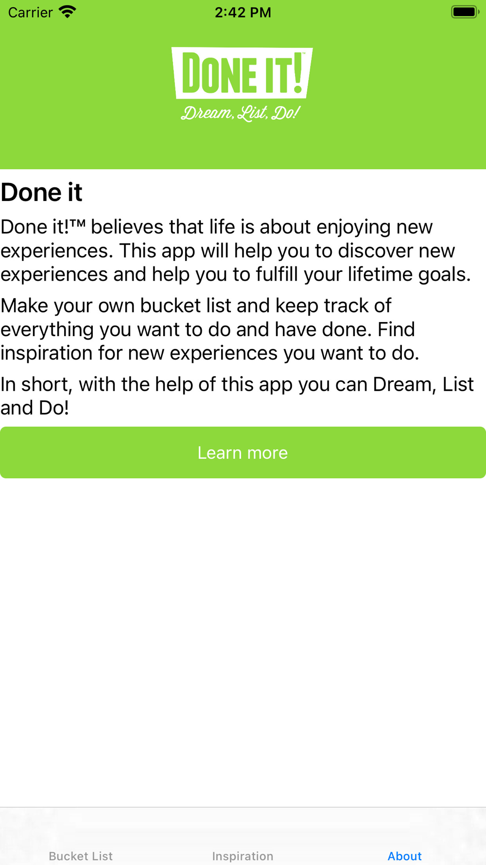 Done it!™ believes that life is about enjoying new experiences. This app will help you to discover new experiences and help you to fulfill your lifetime goals.