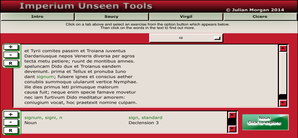Imperium Unseen Tools will help in understanding the Latin language and how it works. It offers a dictionary at the front end, which presents words and their dictionary entries in a conventional way. From here the user can follow through to the second level, where each word is shown within its immediate system. In the case of non-inflected words, this is kept to a minimum, but in the case of nouns, adjectives and verbs, the whole system is shown. So, for example, a noun is shown with endings for all of its six cases, in the singular and plural. The exact form of the word as it appeared in the text is highlit in green, but this appears in each part of the table where it may be repeated, so the user can see all of the possible correct analyses for it. In the case of the word 'servi', for example, the word would appear in green three times, in the genitive singular, the nominative plural and the vocative plural. A set of texts is also presented, which explains the terms used in all of the possible analyses.