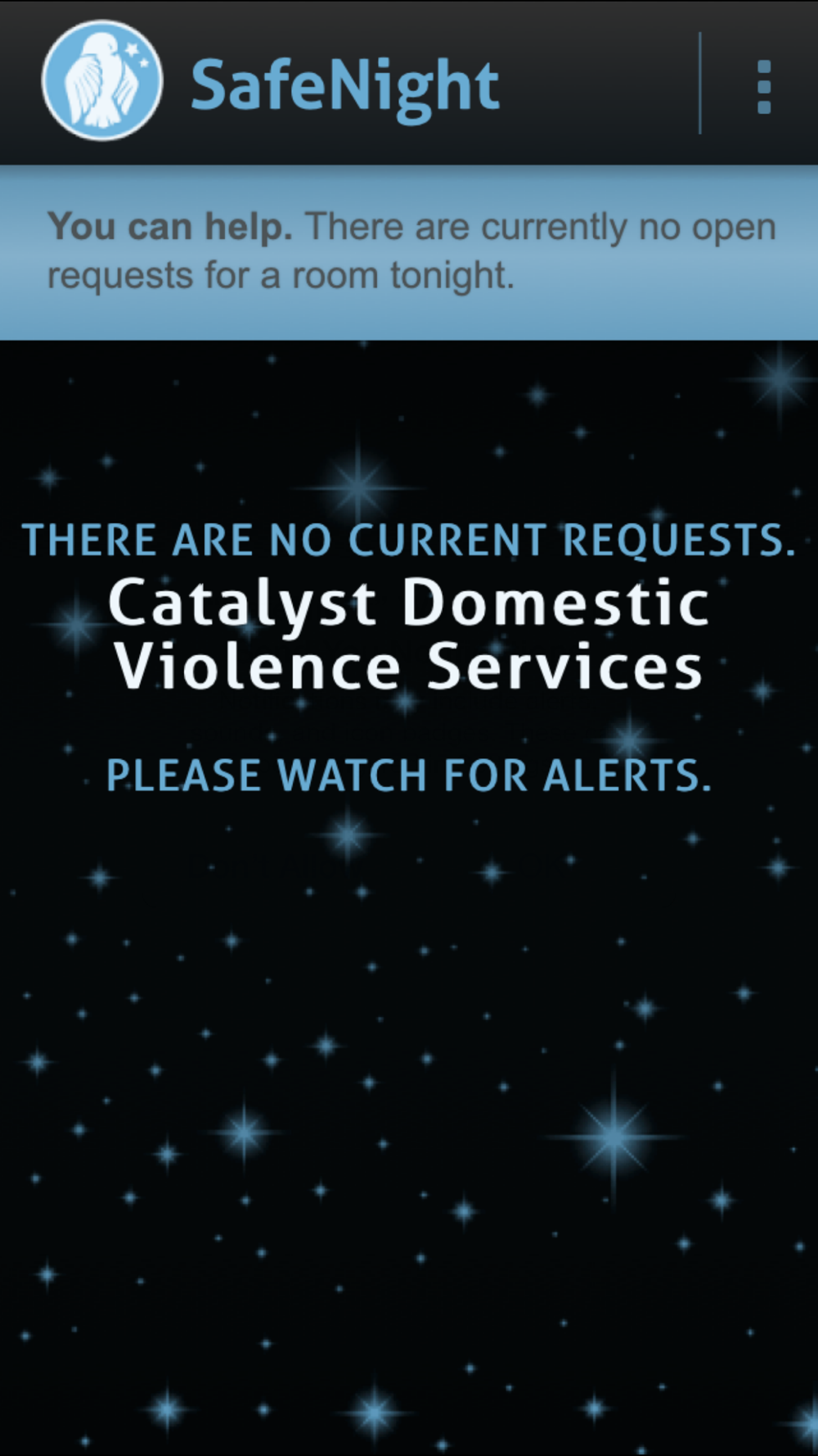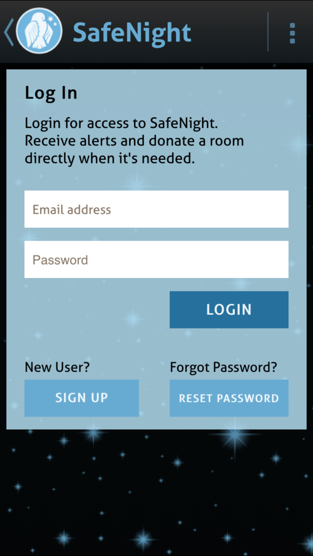 People who want to help those in need of safe shelter download the SafeNight app and set up a profile. They receive an alert when someone needs a safe place to stay and there is no available space in a shelter. The app lets them make an immediate donation to pay for a hotel room for the person in need.