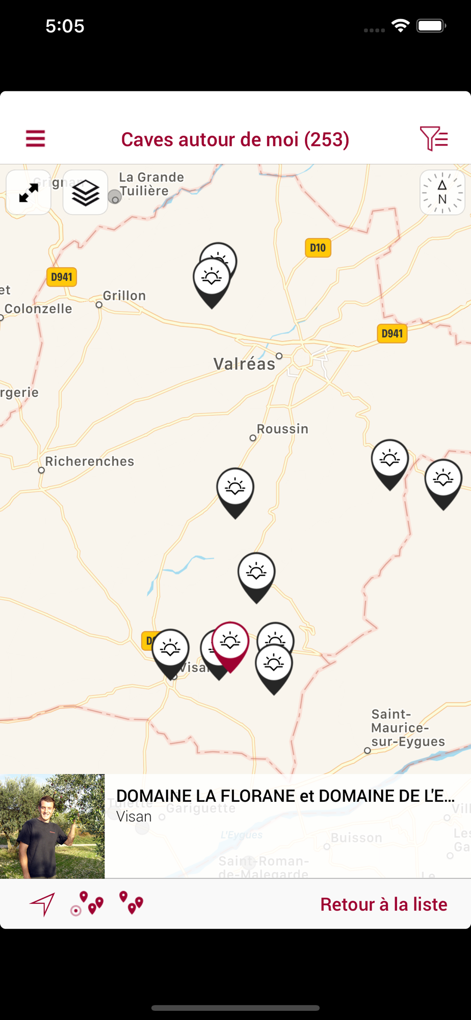D'un clic, appelez la cave sélectionnée, envoyez un mail ou un texto, puis demandez à Plans de vous y emmener.