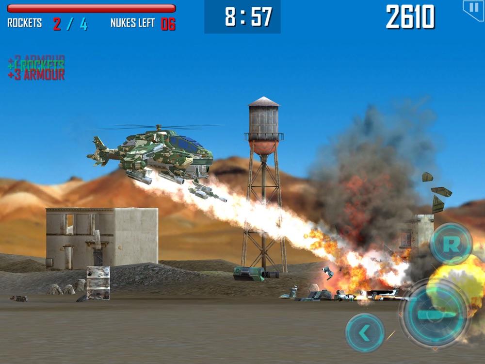Take control of AirHound, an advanced military assault Chopper in challenging "behind enemy line" missions. Battle against infinite number of enemies while extracting nuclear weapons before time runs out. Save the world by getting rid of Nukes!