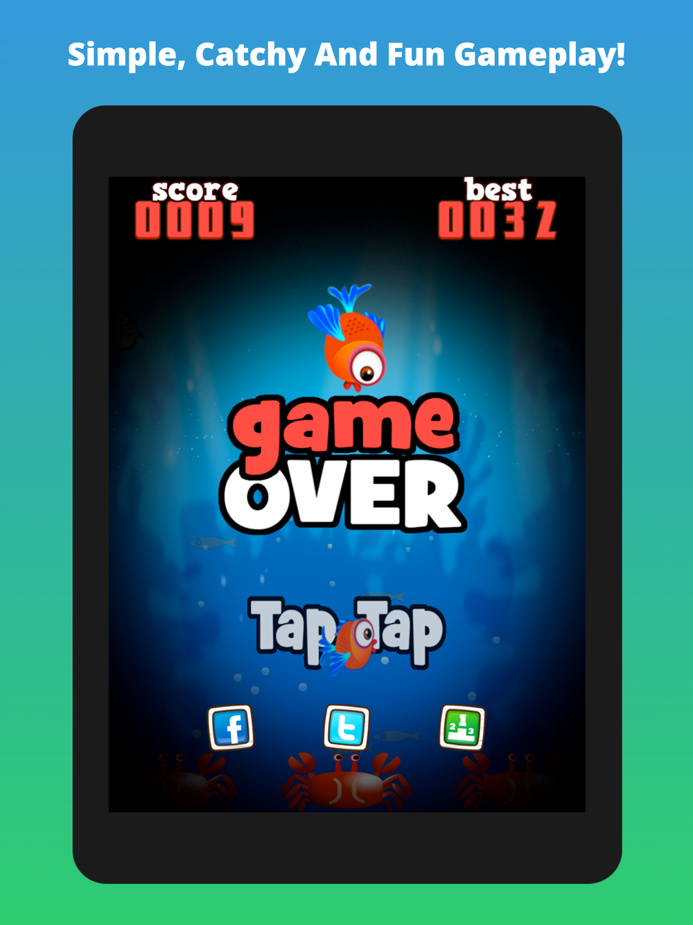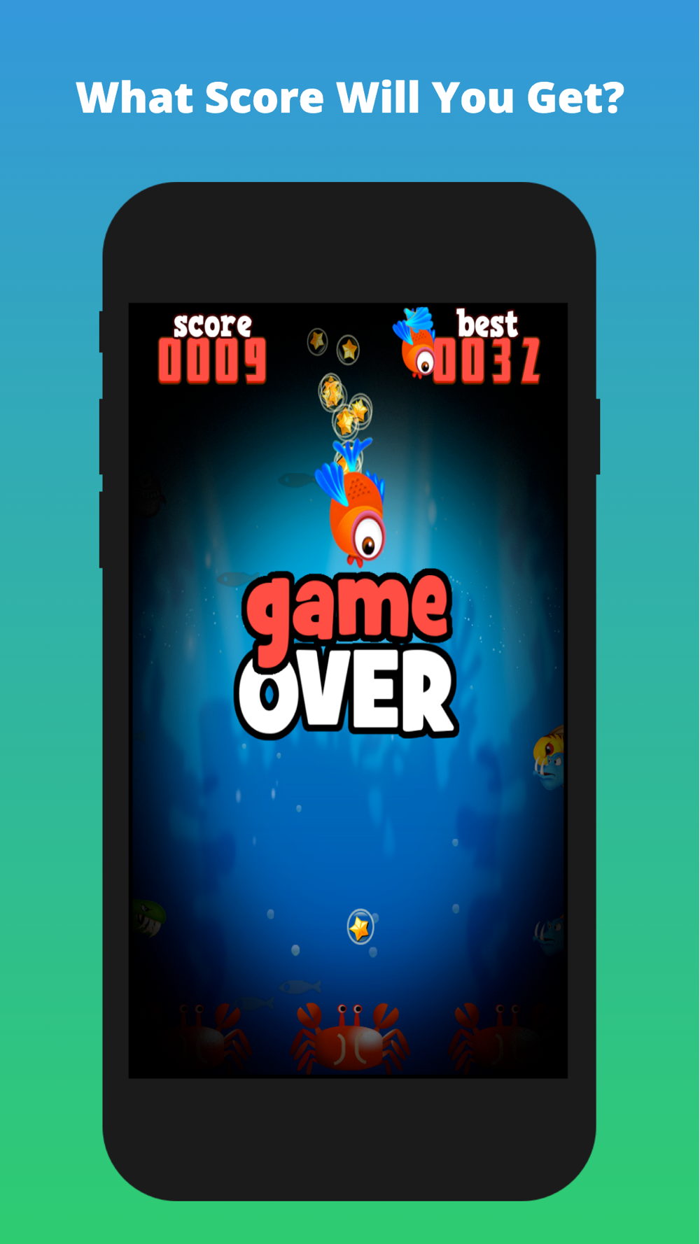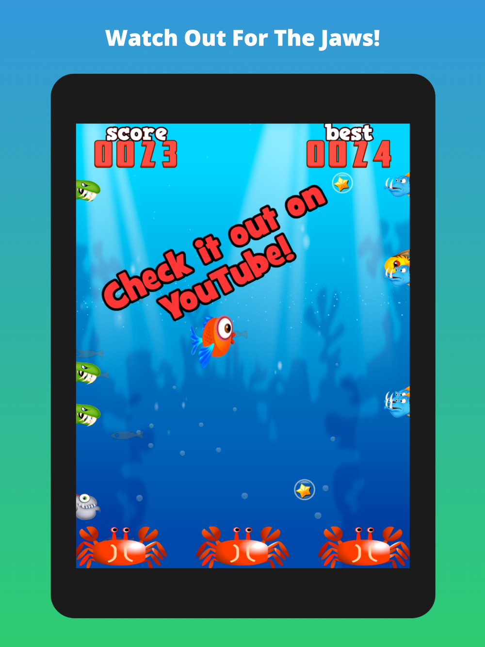 Tap to swim from side to side scoring 1 point or go for a star and score 5 points. Watch out for the mean fish on each side, the crabs at the bottom who are watching you and don't go too high cos you can't breathe out of the water … What score will you get and can you beat it ???