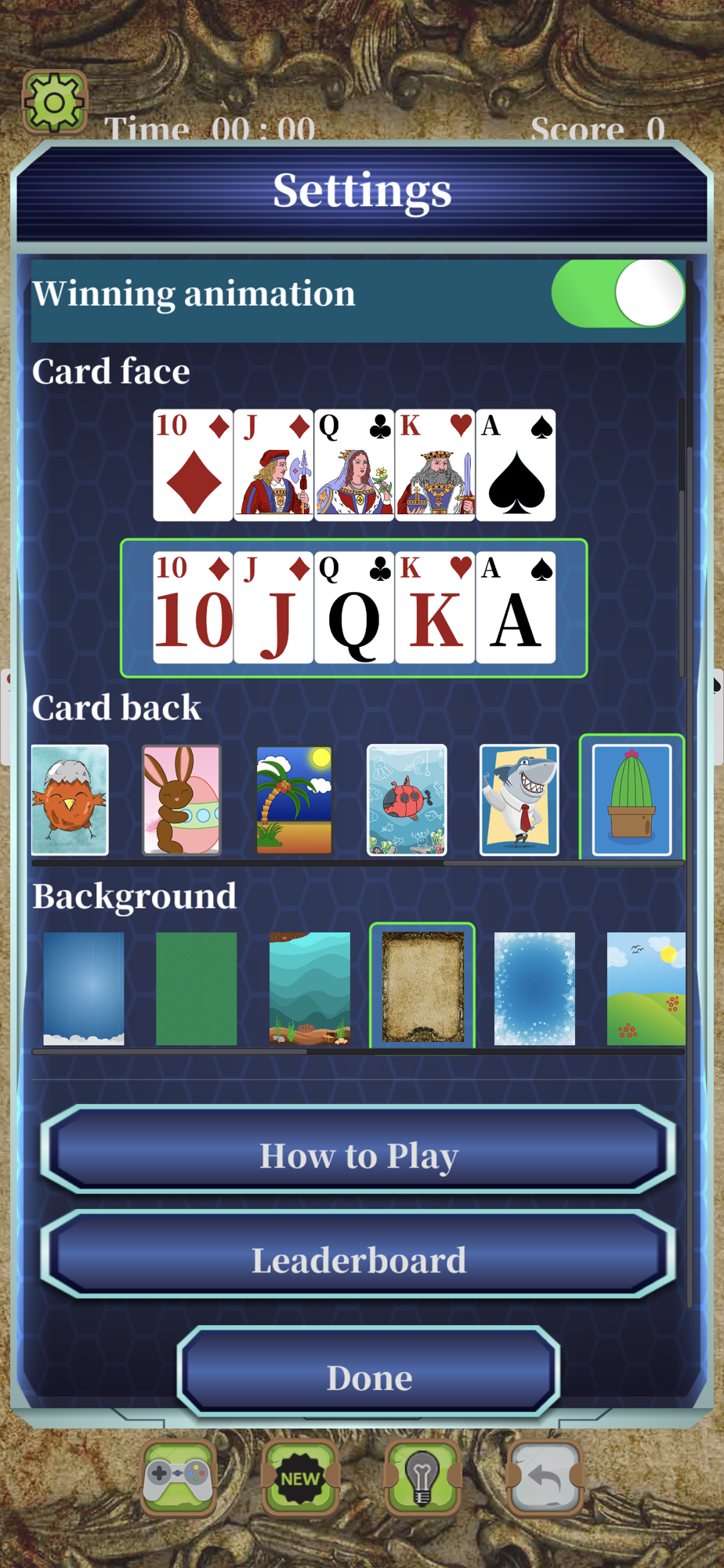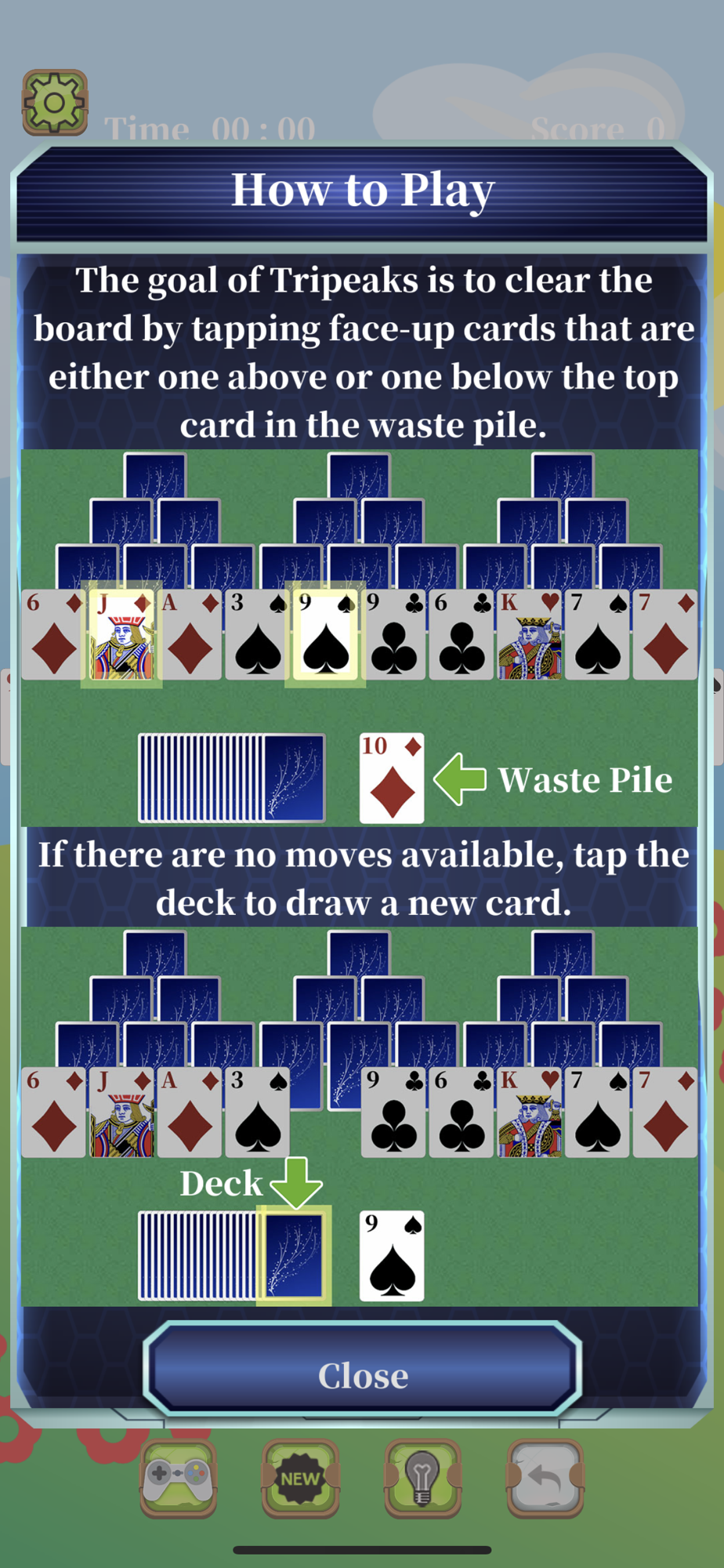The goal of Tripeaks is to clear the board by tapping face-up cards that are either one above or one below the top card in the waste pile.