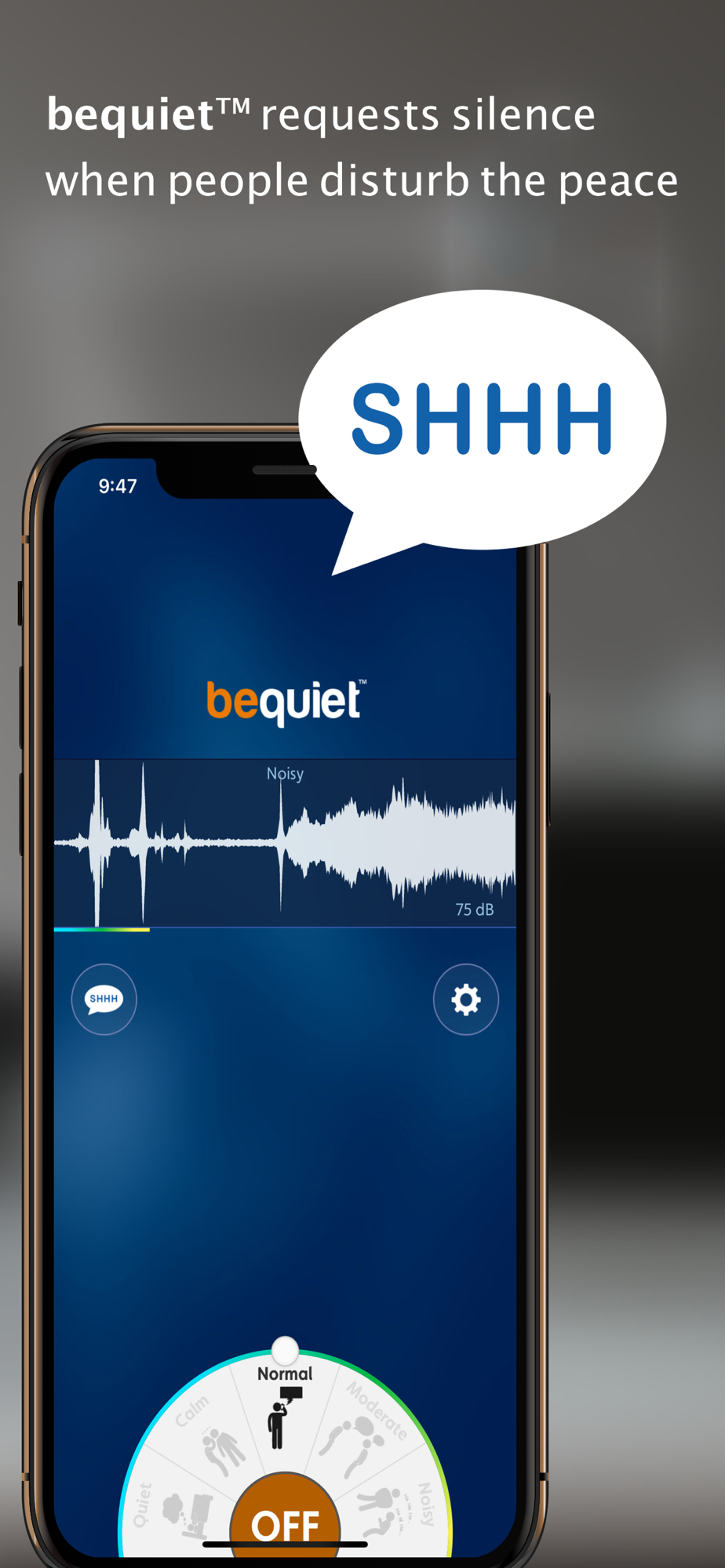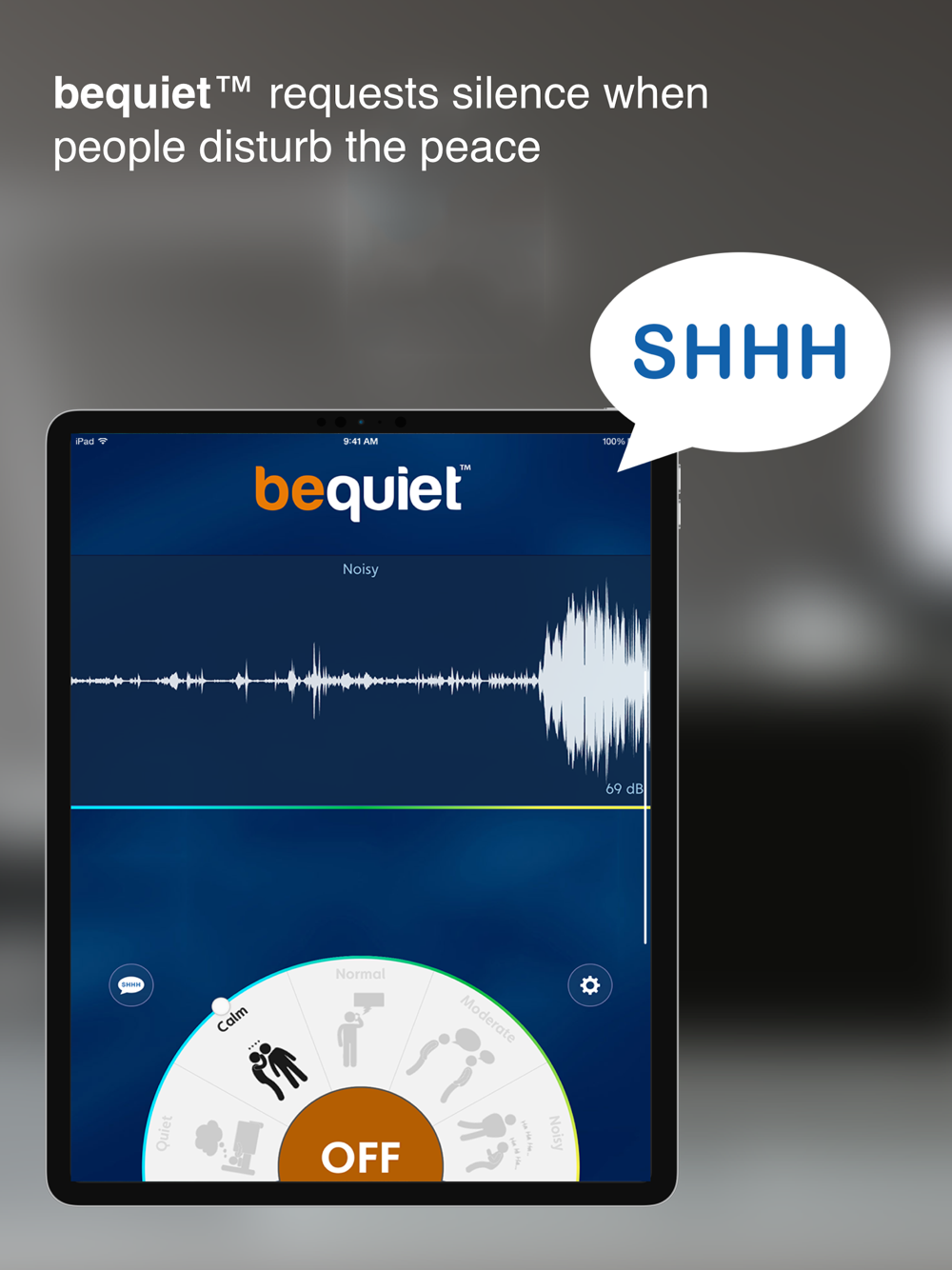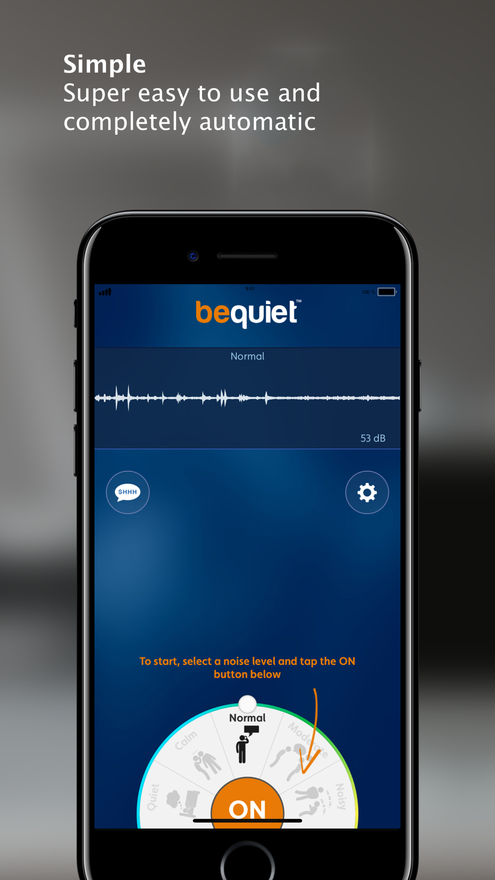 Select the noise level to suit your environment and press the ON button. When the noise goes above that level for a certain time, bequiet™ automatically "shhh" people.
