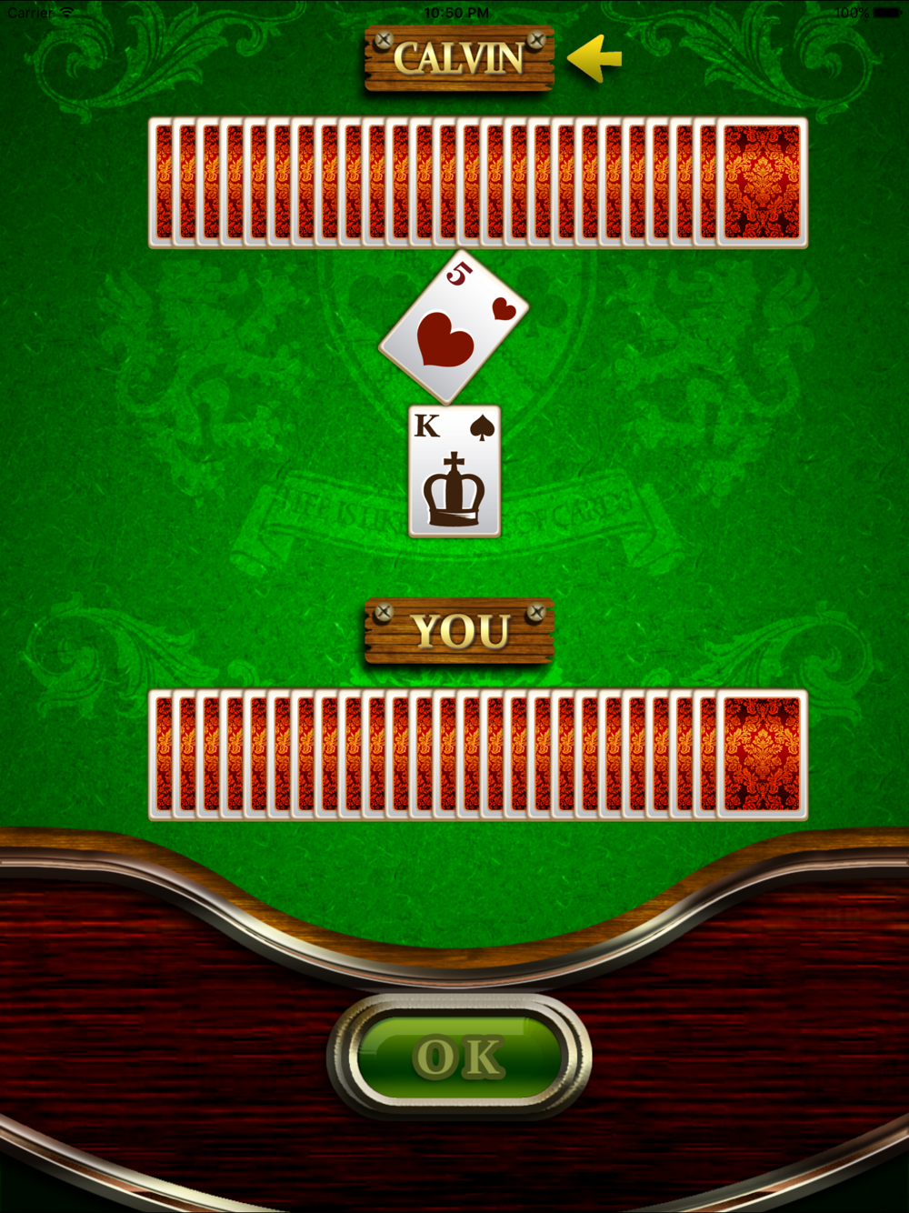 The rule is very simple. This game is one-to-one. If players play cards of the same rank, "War"(War's most exciting point) happens. The battle can be done with 3 or 5 cards each other. This application is designed for iPhone & iPad. You can enjoy very exciting War, the card game.