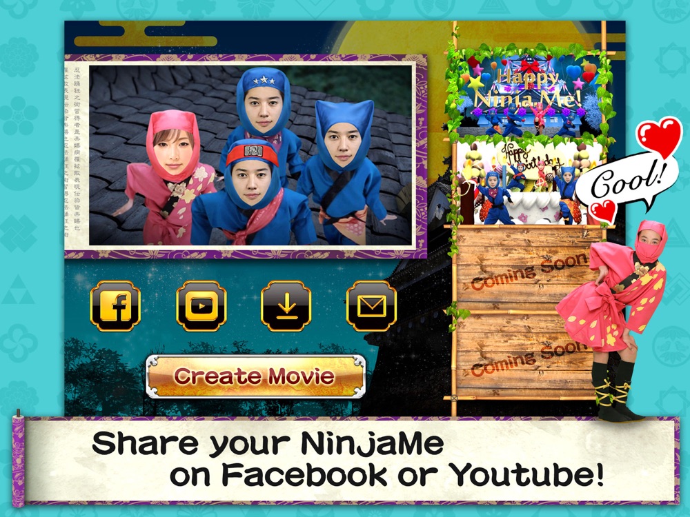 “MotionPortrait”的“我是忍者”(NinjaMe) 能够立即把你变成一个有趣的舞动的忍者。仅仅只需要运用你的相机拍照或者来自Facebook的图片相册的人物头像图片,就可以创建自己,家人和朋友的个性化的忍者视频。你可以通过Facebook,Youtube以及Email和你的朋友分享你的视频。