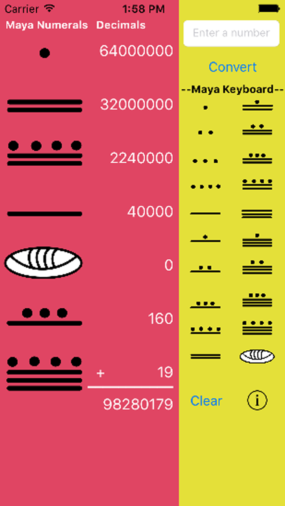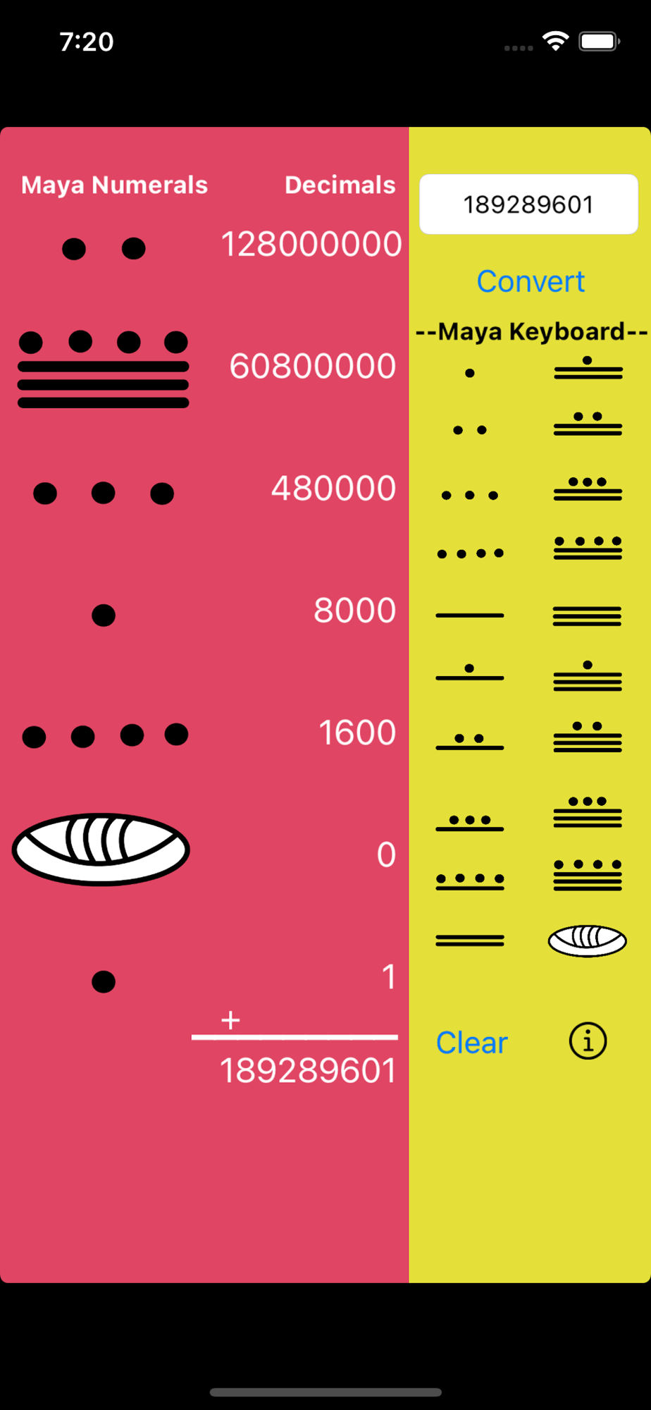 This app simultaneously displays user generated Maya numbers and their equivalent decimal values at each place value, as well as the final decimal equivalencies for Maya numbers 1 to 1,279,999,999.