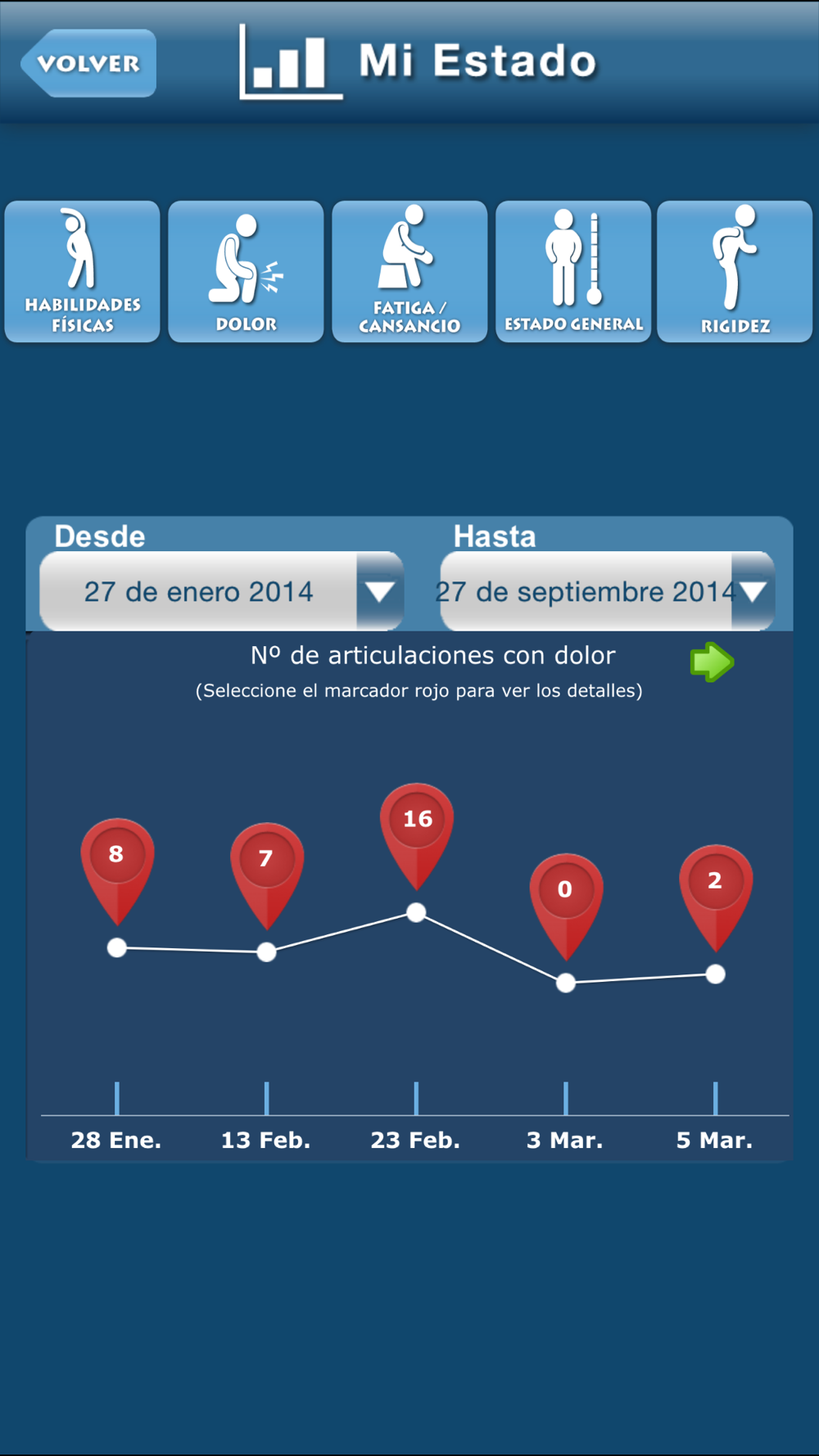 ANDAR is a multiplatform application (Web, iPhone and iPAD) developed in spanish language designed to help rheumatoid arthritis patients to control their disease through which you can fill different validated questionnaires for the evolution follow-up of rheumatoid arthritis. Also you can keep track and control of medications, to set alerts, keep a patient diary, enter appointments with your doctor, etc. .. The tool also offers a version for healthcare professionals that allows them to track their patients.