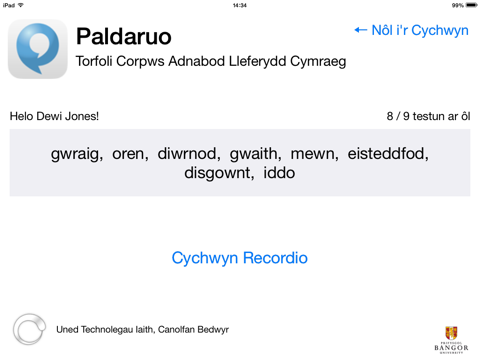Paldaruo is an ap that allows Welsh speakers to contribute their voice to the GALLU project. GALLU (Gwaith Adnabod Lleferydd Uwch) aims to crowdsource a speech corpus for the main purpose of developing Welsh language speech recognition.
