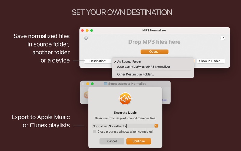 MP3 Normalizer allows exporting tracks to a new or existing iTunes or Music app playlist quickly and easily.