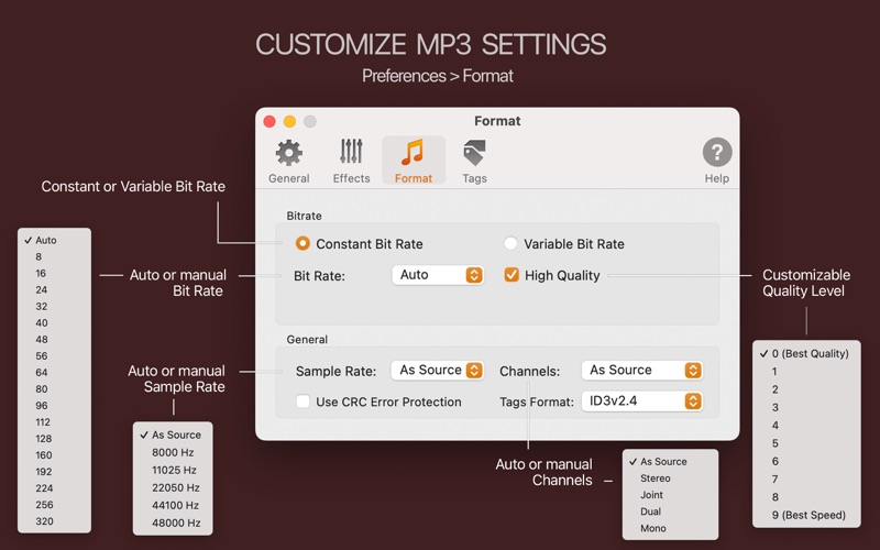 If you would like to convert to a particular Bit Rate, Channels, etc., change the Preferences / Format settings.